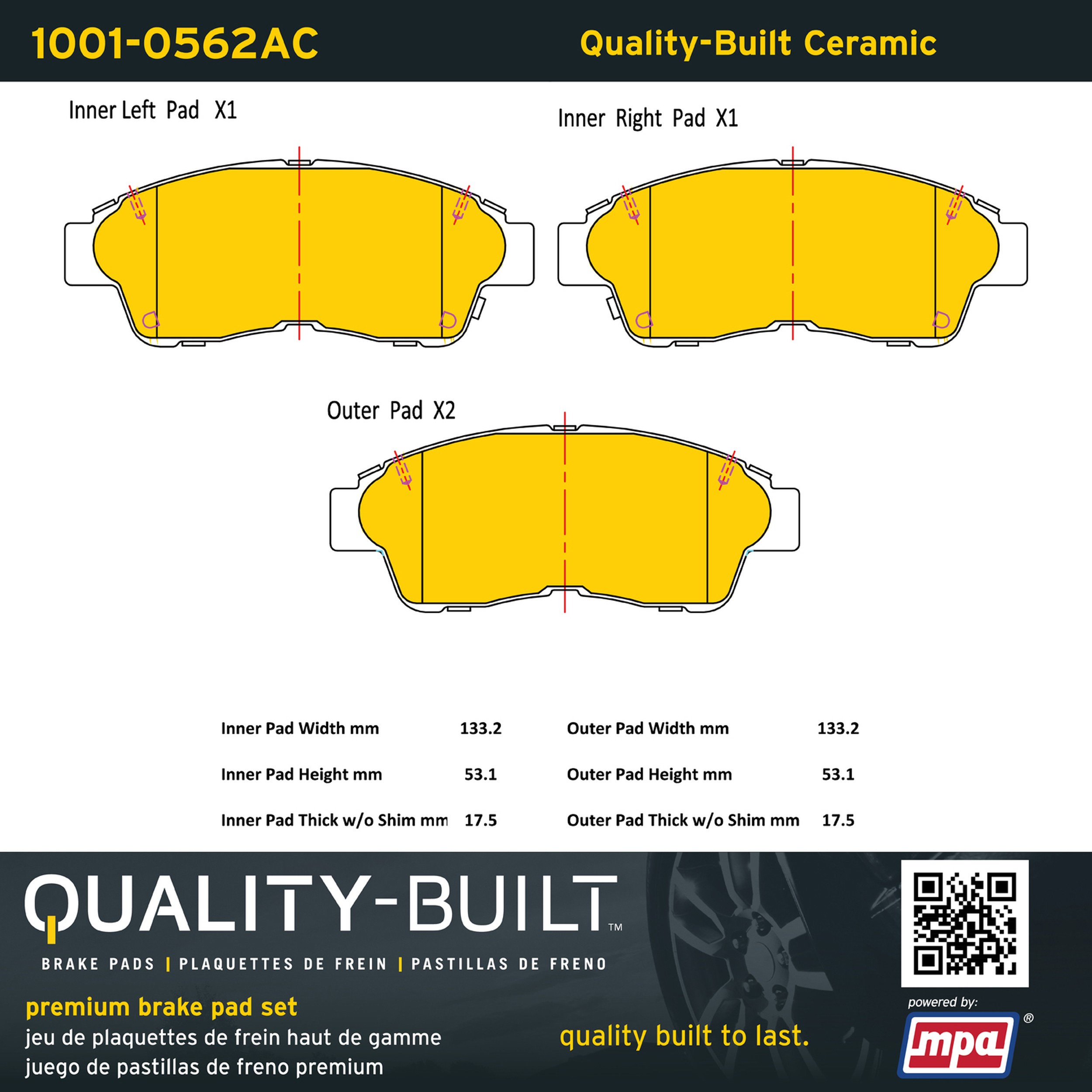 - Quality-Built Premium Brake Pads provide optimized stopping power in all conditions. Application-specific pad formulas remove the guesswork from pad selection by providing friction compounds engineered to restore like-new stopping power for every vehicle. 2025 compliant, copper-free friction formulas deliver dependable performance across a wide thermal range with low brake dust and zero noise.