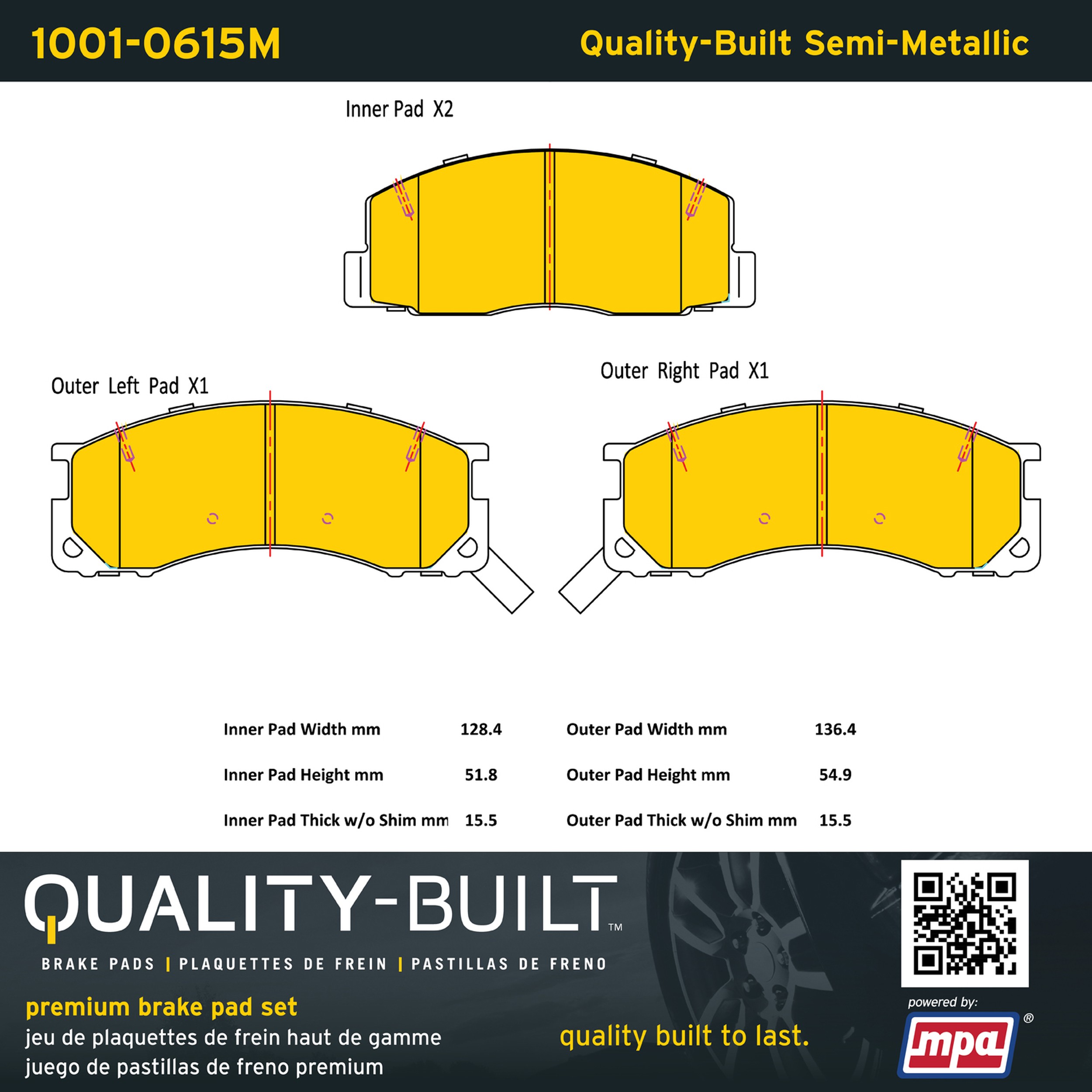 - Quality-Built Premium Brake Pads provide optimized stopping power in all conditions. Application-specific pad formulas remove the guesswork from pad selection by providing friction compounds engineered to restore like-new stopping power for every vehicle. 2025 compliant, copper-free friction formulas deliver dependable performance across a wide thermal range with low brake dust and zero noise.