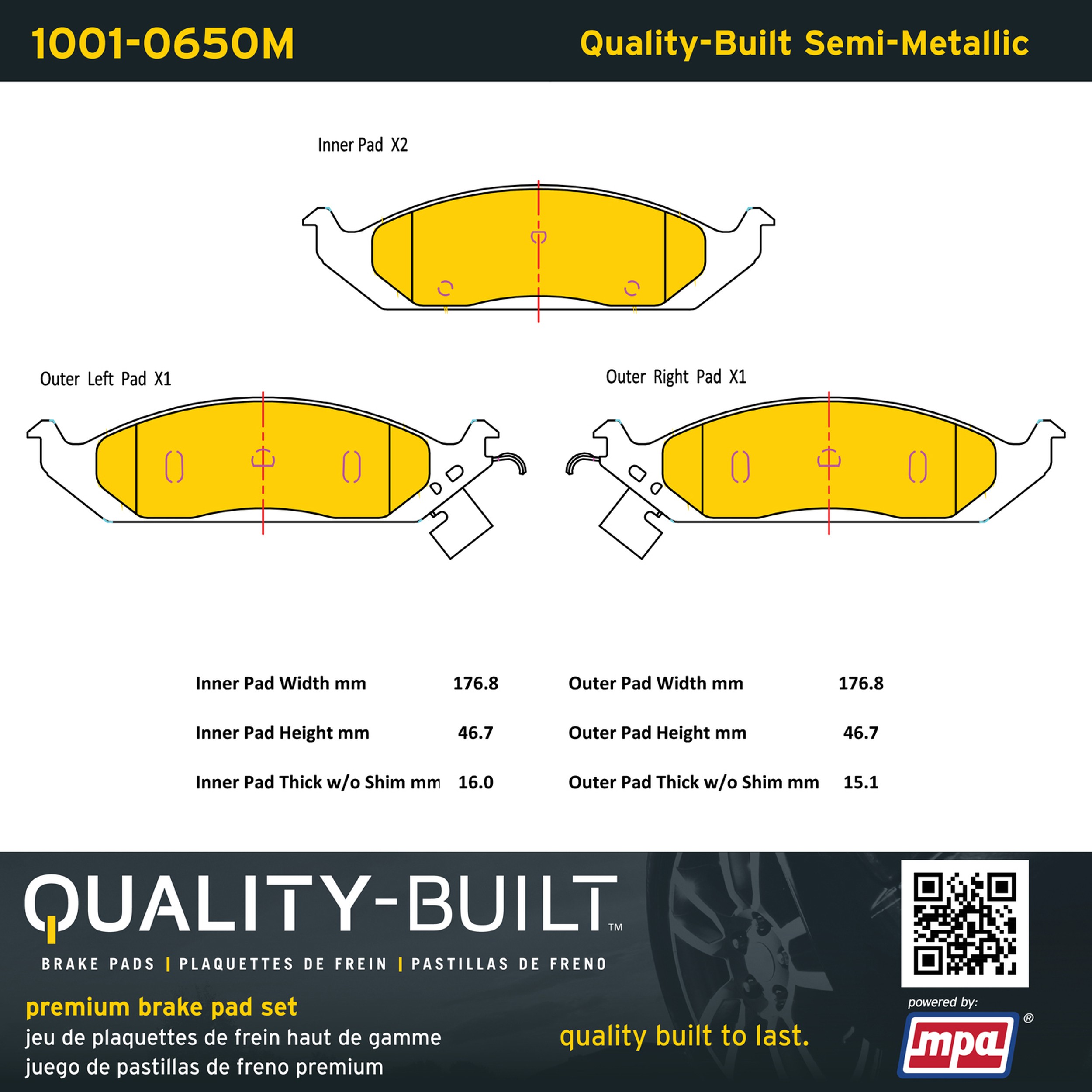 - Quality-Built Premium Brake Pads provide optimized stopping power in all conditions. Application-specific pad formulas remove the guesswork from pad selection by providing friction compounds engineered to restore like-new stopping power for every vehicle. 2025 compliant, copper-free friction formulas deliver dependable performance across a wide thermal range with low brake dust and zero noise.