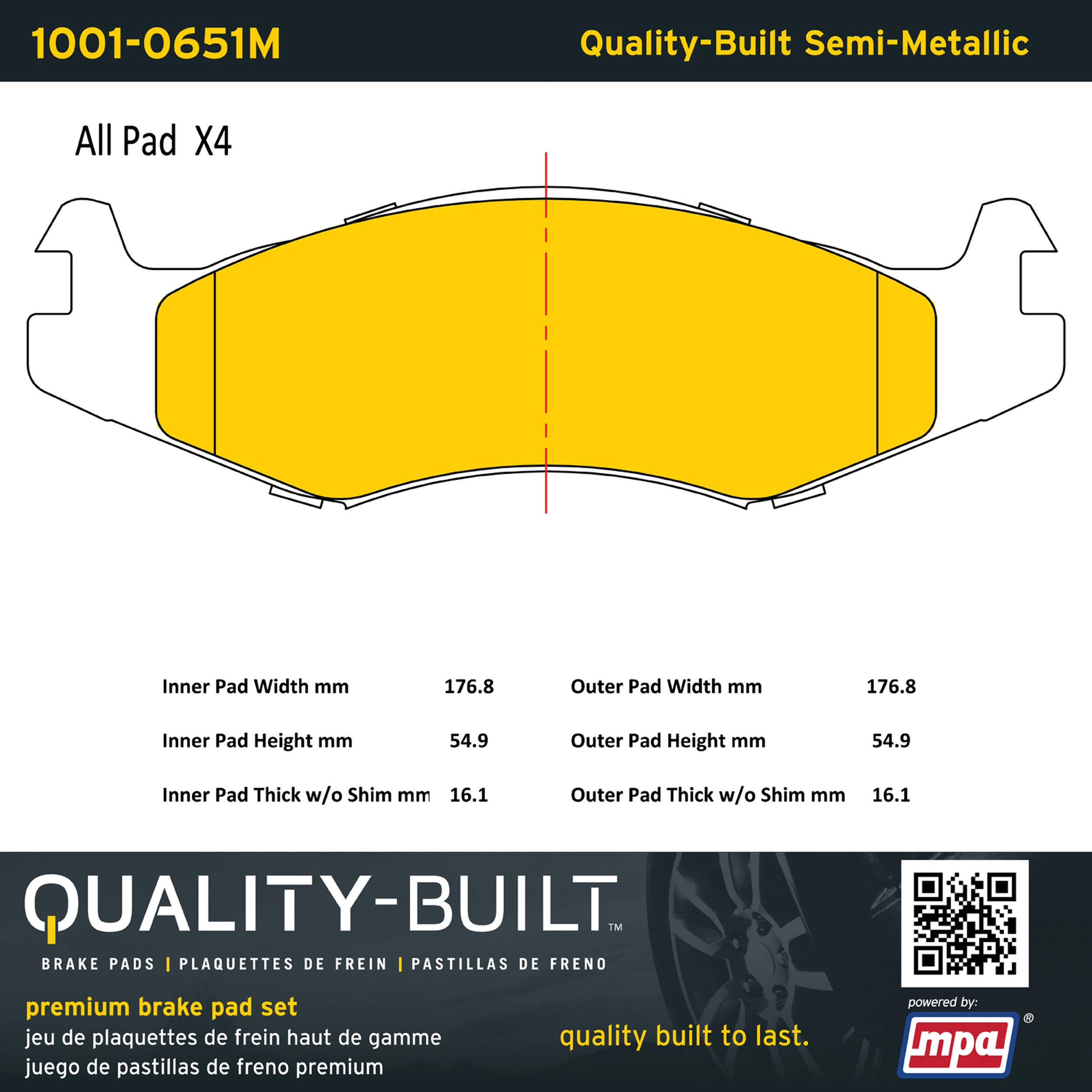 - Quality-Built Premium Brake Pads provide optimized stopping power in all conditions. Application-specific pad formulas remove the guesswork from pad selection by providing friction compounds engineered to restore like-new stopping power for every vehicle. 2025 compliant, copper-free friction formulas deliver dependable performance across a wide thermal range with low brake dust and zero noise.