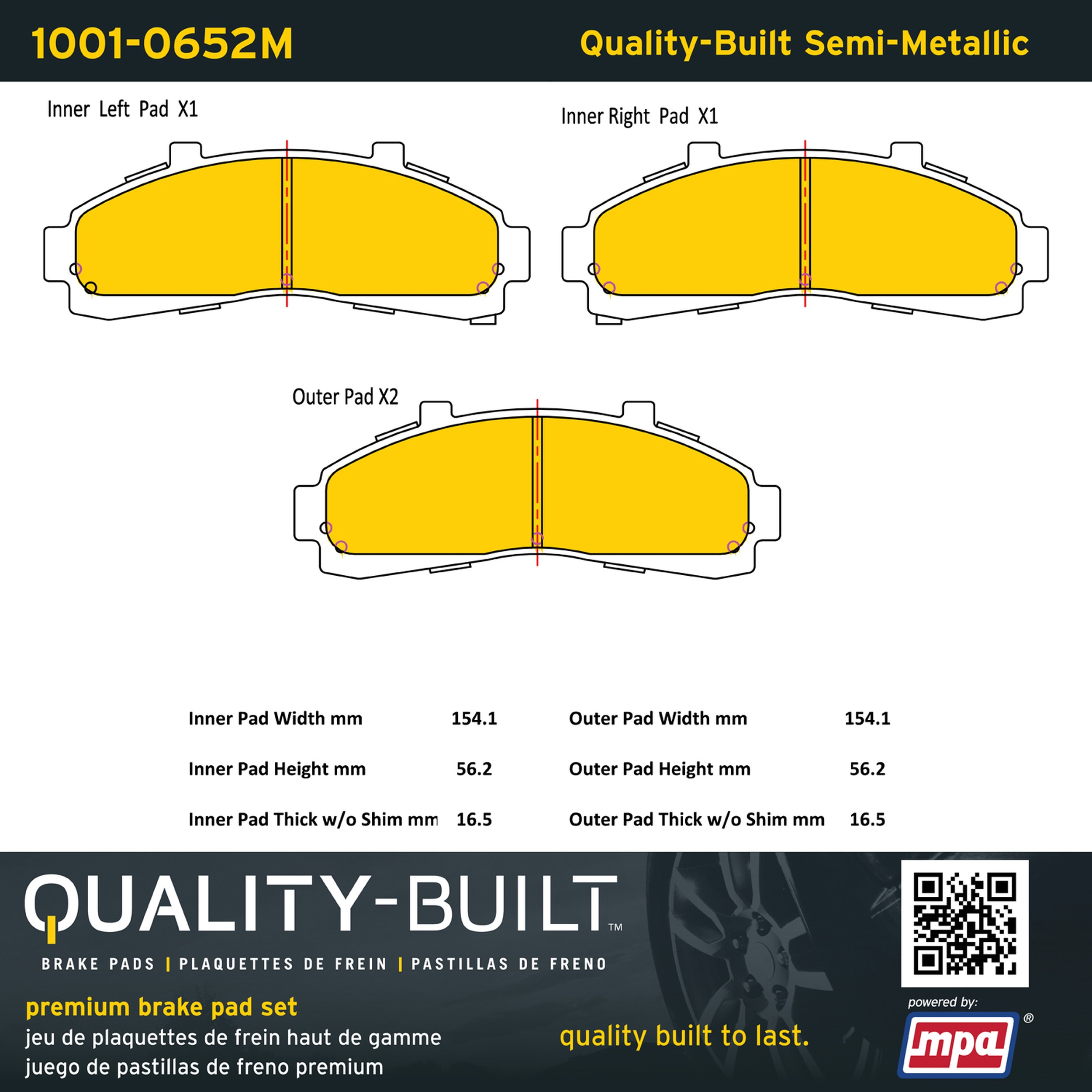 - Quality-Built Premium Brake Pads provide optimized stopping power in all conditions. Application-specific pad formulas remove the guesswork from pad selection by providing friction compounds engineered to restore like-new stopping power for every vehicle. 2025 compliant, copper-free friction formulas deliver dependable performance across a wide thermal range with low brake dust and zero noise.