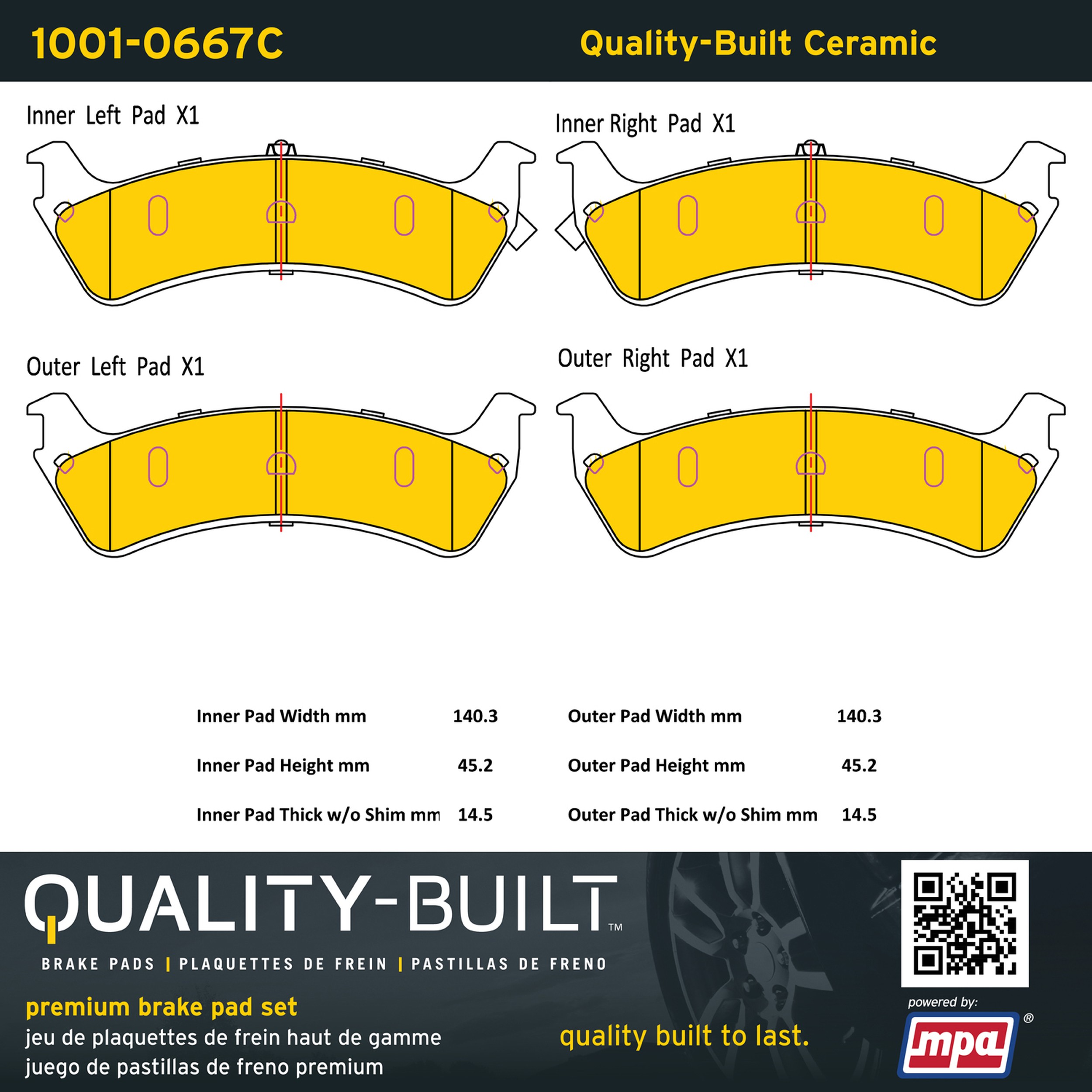 • Quality-Built Premium Brake Pads provide optimized stopping power in all conditions. Application-specific pad formulas remove the guesswork from pad selection by providing friction compounds engineered to restore like-new stopping power for every vehicle. 2025 compliant, copper-free friction formulas deliver dependable performance across a wide thermal range with low brake dust and zero noise.