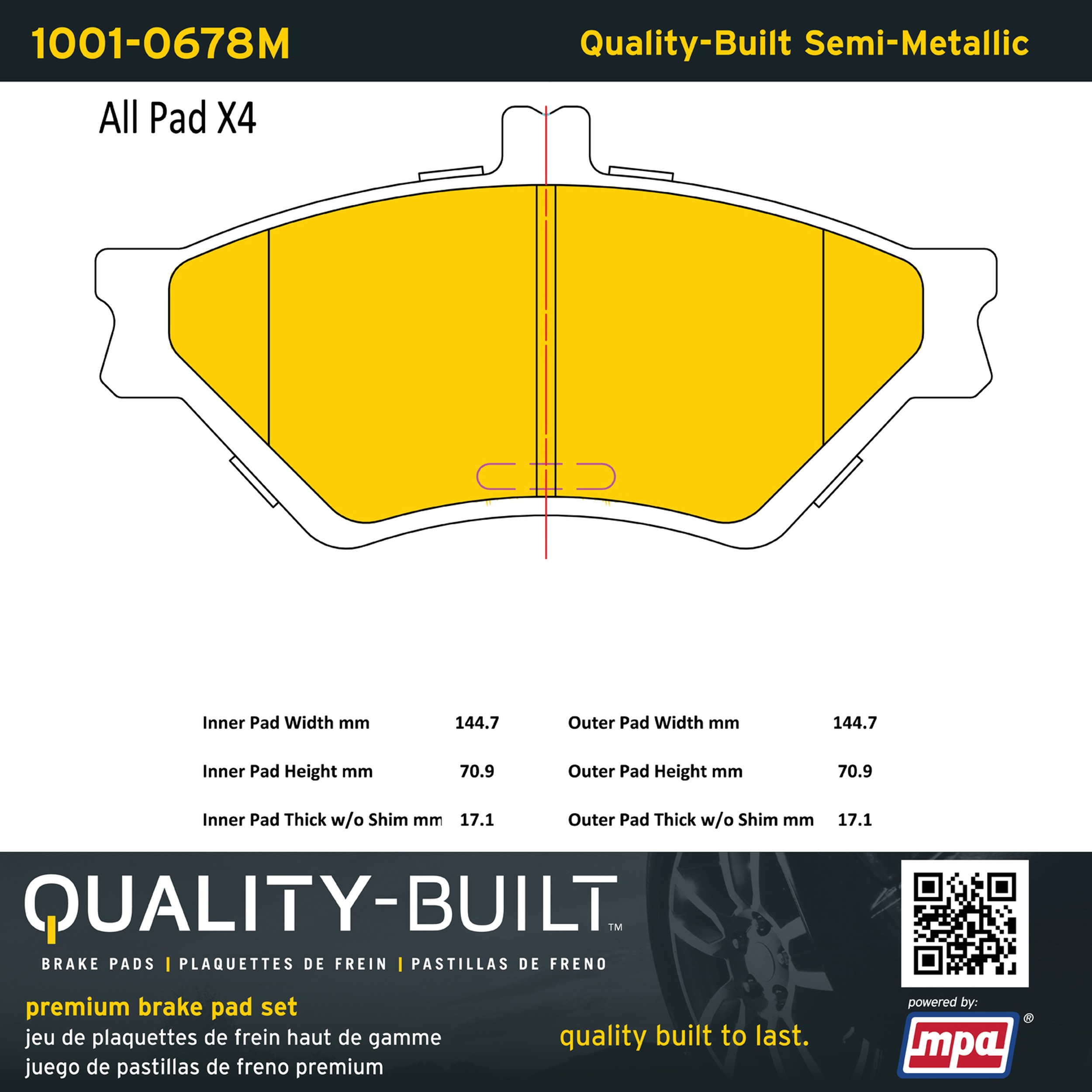 - Quality-Built Premium Brake Pads provide optimized stopping power in all conditions. Application-specific pad formulas remove the guesswork from pad selection by providing friction compounds engineered to restore like-new stopping power for every vehicle. 2025 compliant, copper-free friction formulas deliver dependable performance across a wide thermal range with low brake dust and zero noise.