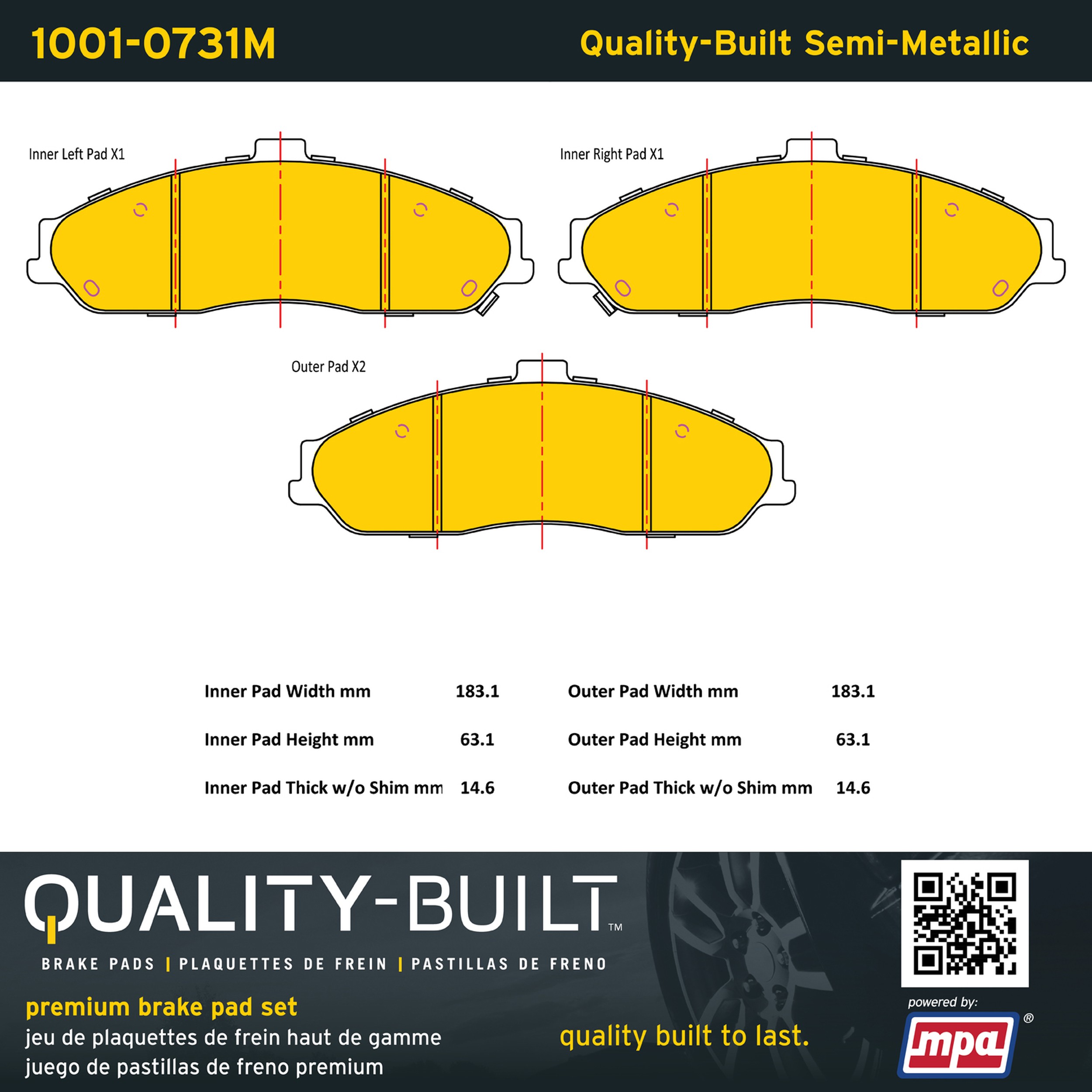 - Quality-Built Premium Brake Pads provide optimized stopping power in all conditions. Application-specific pad formulas remove the guesswork from pad selection by providing friction compounds engineered to restore like-new stopping power for every vehicle. 2025 compliant, copper-free friction formulas deliver dependable performance across a wide thermal range with low brake dust and zero noise.