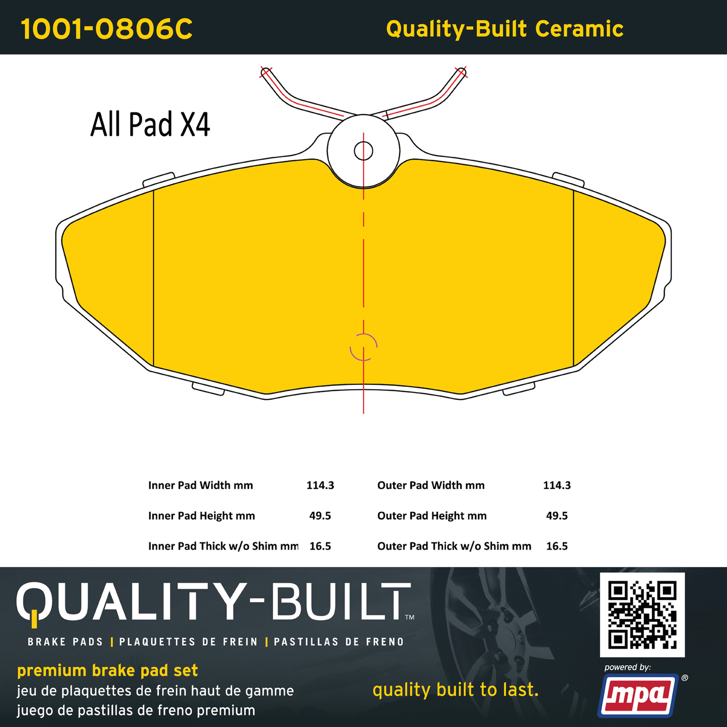 - Quality-Built Premium Brake Pads provide optimized stopping power in all conditions. Application-specific pad formulas remove the guesswork from pad selection by providing friction compounds engineered to restore like-new stopping power for every vehicle. 2025 compliant, copper-free friction formulas deliver dependable performance across a wide thermal range with low brake dust and zero noise.