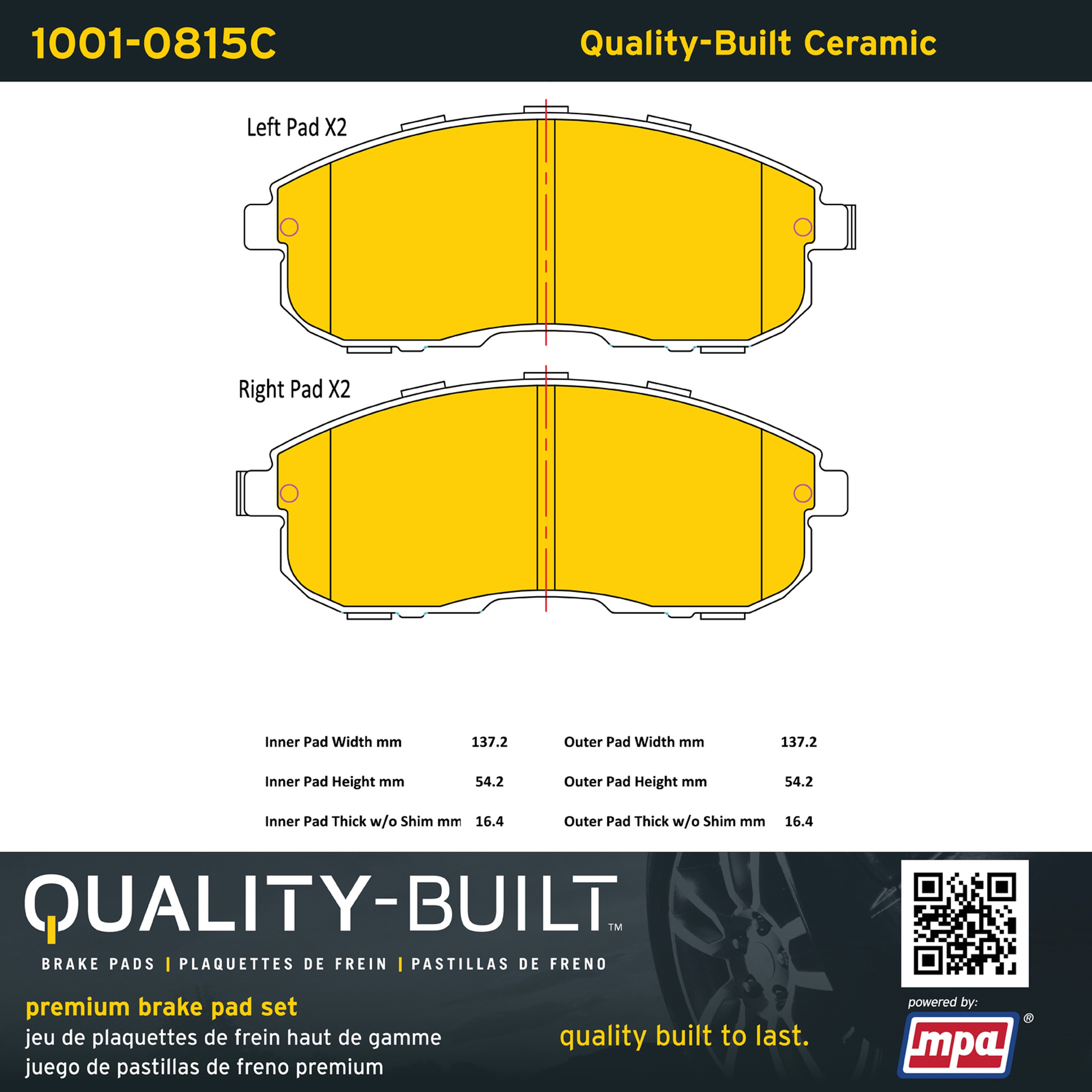 - Quality-Built Premium Brake Pads provide optimized stopping power in all conditions. Application-specific pad formulas remove the guesswork from pad selection by providing friction compounds engineered to restore like-new stopping power for every vehicle. 2025 compliant, copper-free friction formulas deliver dependable performance across a wide thermal range with low brake dust and zero noise.