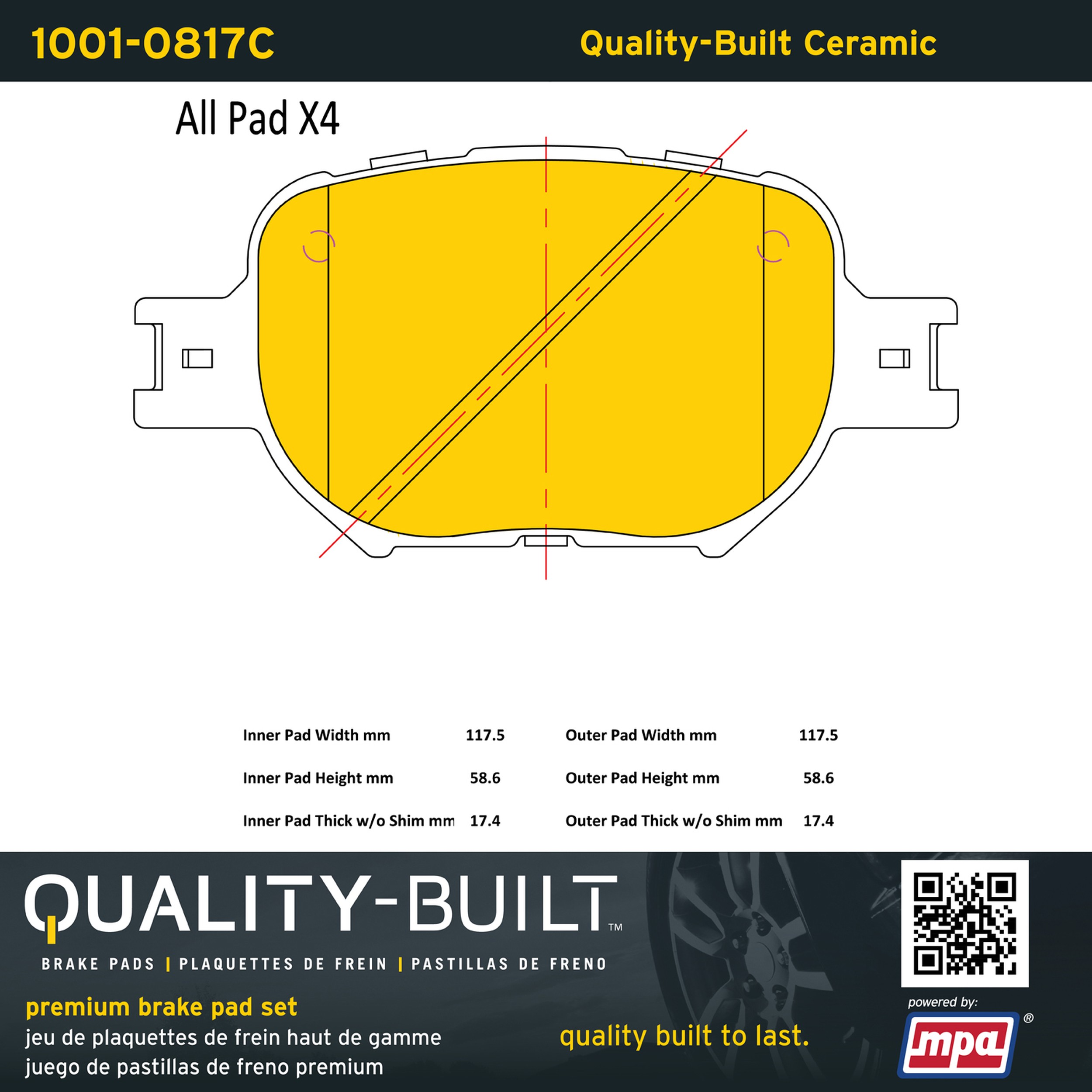 - Quality-Built Premium Brake Pads provide optimized stopping power in all conditions. Application-specific pad formulas remove the guesswork from pad selection by providing friction compounds engineered to restore like-new stopping power for every vehicle. 2025 compliant, copper-free friction formulas deliver dependable performance across a wide thermal range with low brake dust and zero noise.