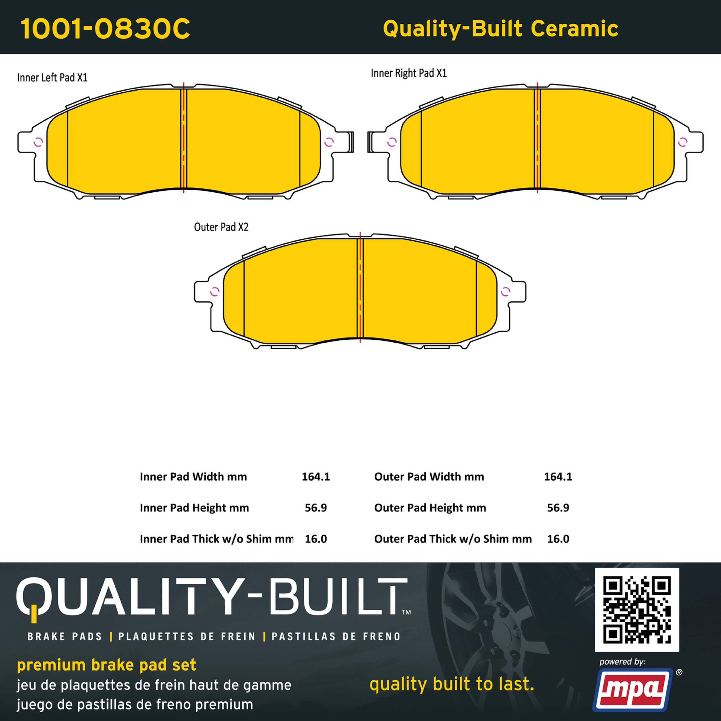 - Quality-Built Premium Brake Pads provide optimized stopping power in all conditions. Application-specific pad formulas remove the guesswork from pad selection by providing friction compounds engineered to restore like-new stopping power for every vehicle. 2025 compliant, copper-free friction formulas deliver dependable performance across a wide thermal range with low brake dust and zero noise.