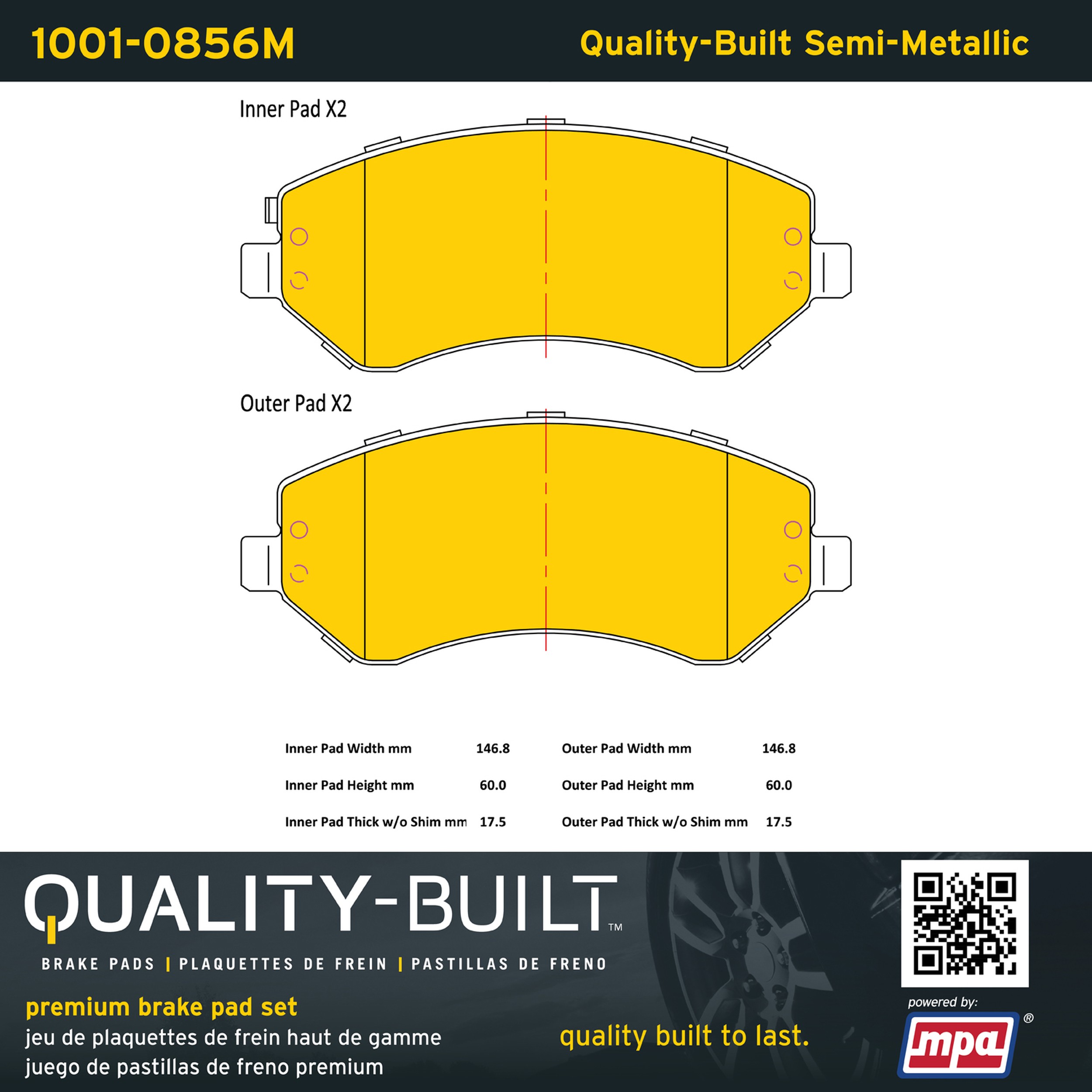 - Quality-Built Premium Brake Pads provide optimized stopping power in all conditions. Application-specific pad formulas remove the guesswork from pad selection by providing friction compounds engineered to restore like-new stopping power for every vehicle. 2025 compliant, copper-free friction formulas deliver dependable performance across a wide thermal range with low brake dust and zero noise.