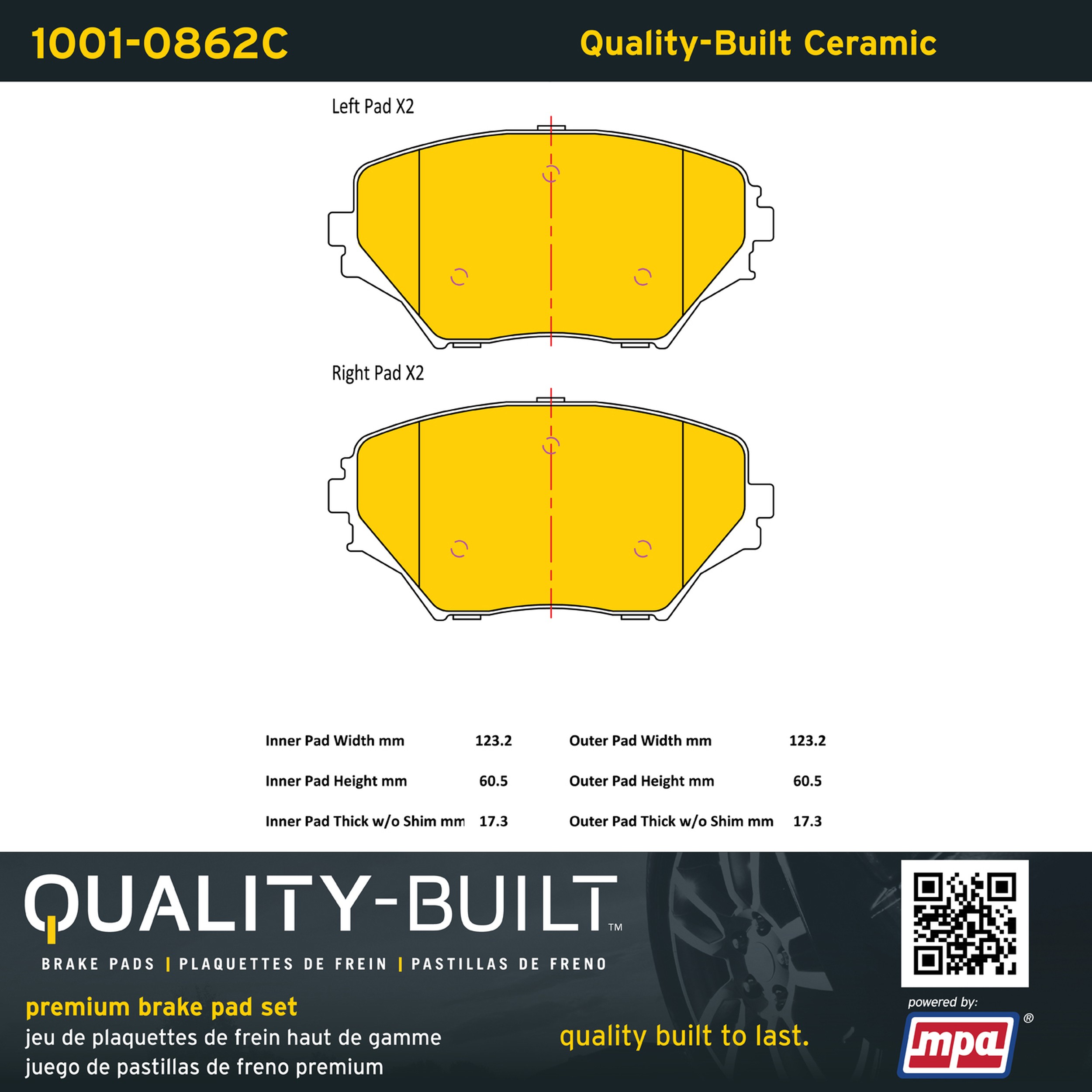 - Quality-Built Premium Brake Pads provide optimized stopping power in all conditions. Application-specific pad formulas remove the guesswork from pad selection by providing friction compounds engineered to restore like-new stopping power for every vehicle. 2025 compliant, copper-free friction formulas deliver dependable performance across a wide thermal range with low brake dust and zero noise.