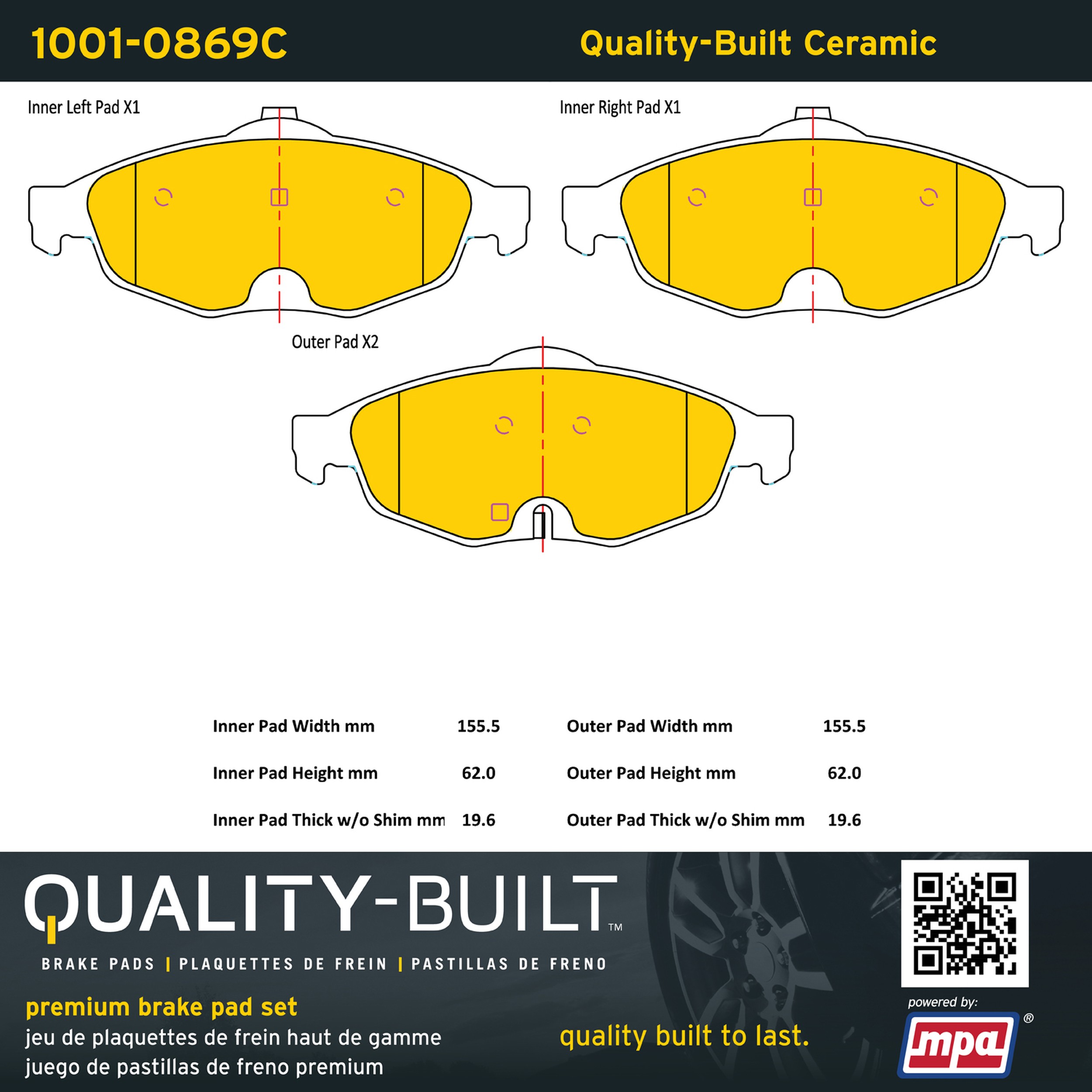 - Quality-Built Premium Brake Pads provide optimized stopping power in all conditions. Application-specific pad formulas remove the guesswork from pad selection by providing friction compounds engineered to restore like-new stopping power for every vehicle. 2025 compliant, copper-free friction formulas deliver dependable performance across a wide thermal range with low brake dust and zero noise.