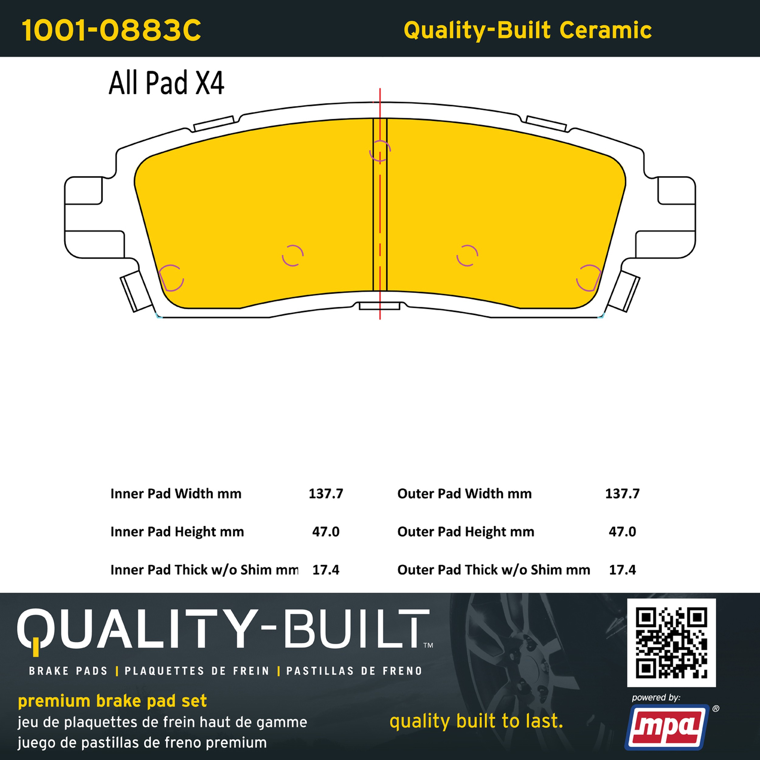 • Quality-Built Premium Brake Pads provide optimized stopping power in all conditions. Application-specific pad formulas remove the guesswork from pad selection by providing friction compounds engineered to restore like-new stopping power for every vehicle. 2025 compliant, copper-free friction formulas deliver dependable performance across a wide thermal range with low brake dust and zero noise.