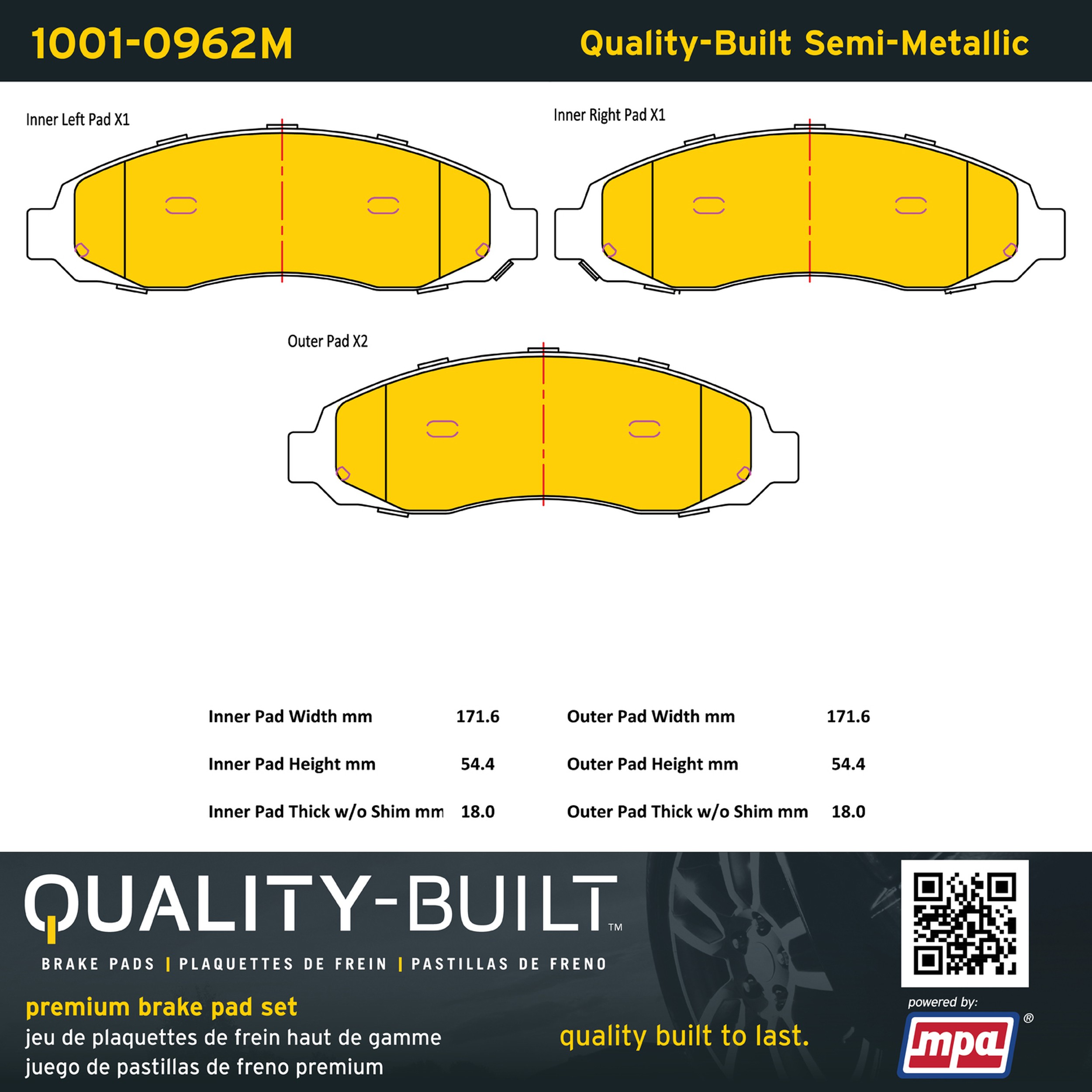- Quality-Built Premium Brake Pads provide optimized stopping power in all conditions. Application-specific pad formulas remove the guesswork from pad selection by providing friction compounds engineered to restore like-new stopping power for every vehicle. 2025 compliant, copper-free friction formulas deliver dependable performance across a wide thermal range with low brake dust and zero noise.