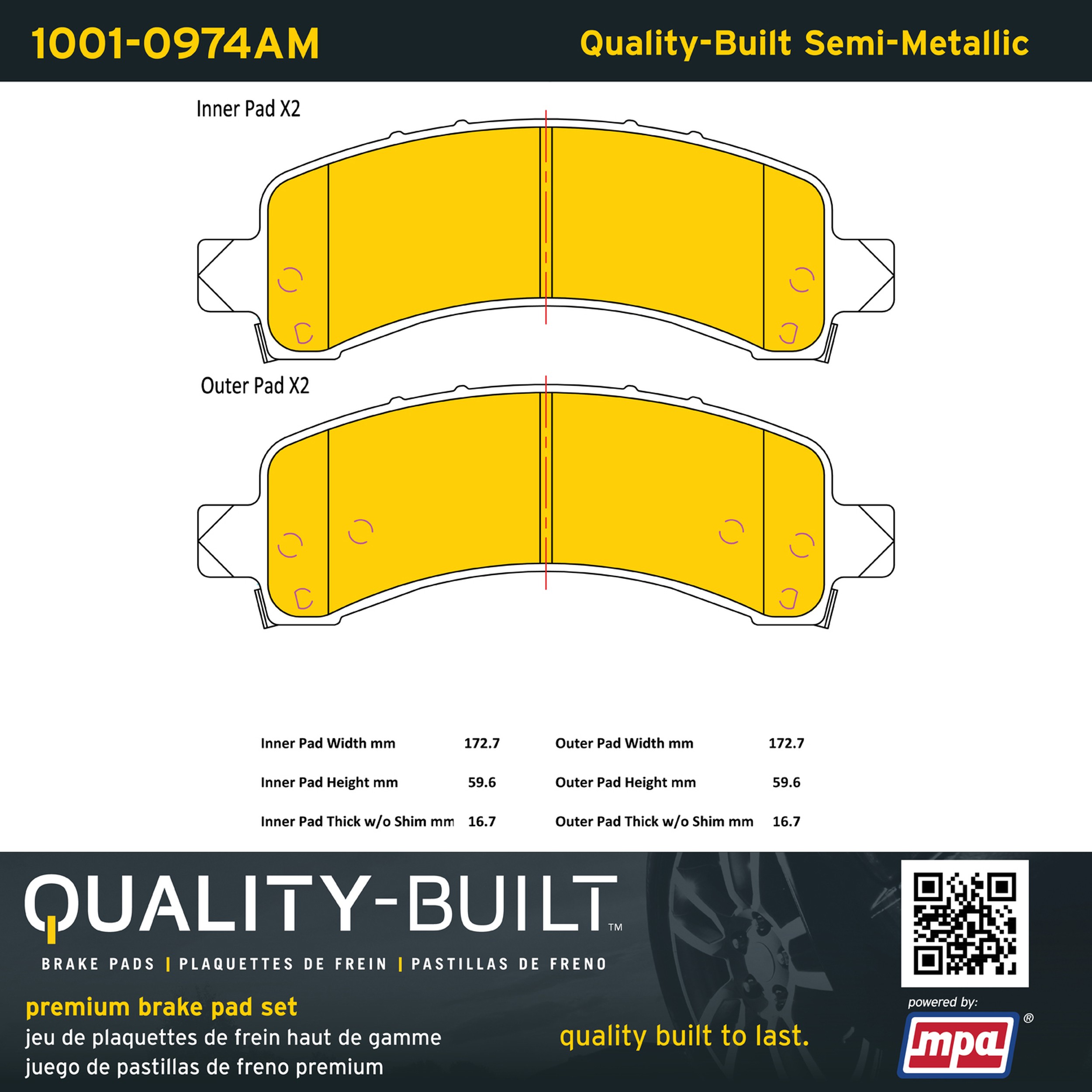 - Quality-Built Premium Brake Pads provide optimized stopping power in all conditions. Application-specific pad formulas remove the guesswork from pad selection by providing friction compounds engineered to restore like-new stopping power for every vehicle. 2025 compliant, copper-free friction formulas deliver dependable performance across a wide thermal range with low brake dust and zero noise.