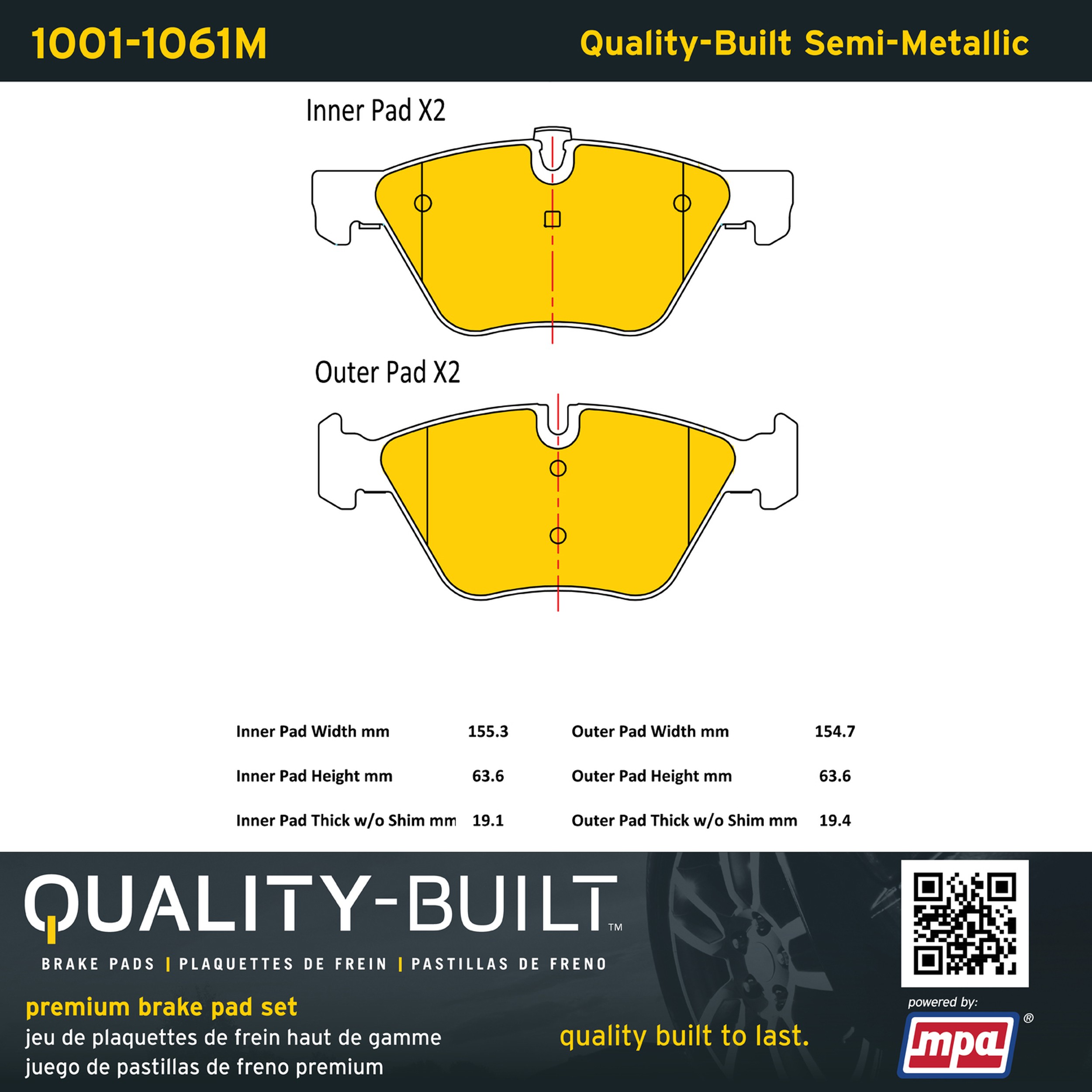 - Quality-Built Premium Brake Pads provide optimized stopping power in all conditions. Application-specific pad formulas remove the guesswork from pad selection by providing friction compounds engineered to restore like-new stopping power for every vehicle. 2025 compliant, copper-free friction formulas deliver dependable performance across a wide thermal range with low brake dust and zero noise.