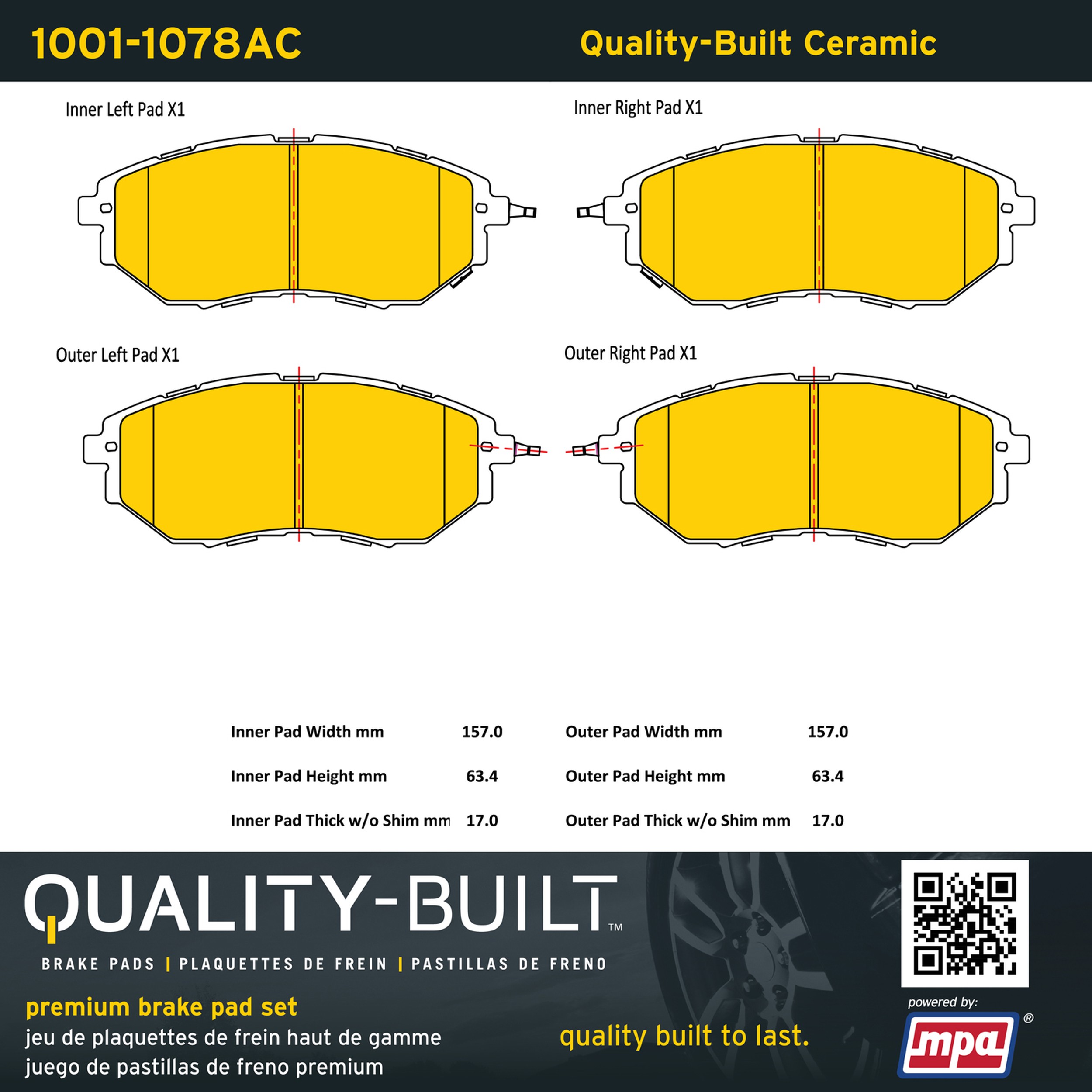 - Quality-Built Premium Brake Pads provide optimized stopping power in all conditions. Application-specific pad formulas remove the guesswork from pad selection by providing friction compounds engineered to restore like-new stopping power for every vehicle. 2025 compliant, copper-free friction formulas deliver dependable performance across a wide thermal range with low brake dust and zero noise.