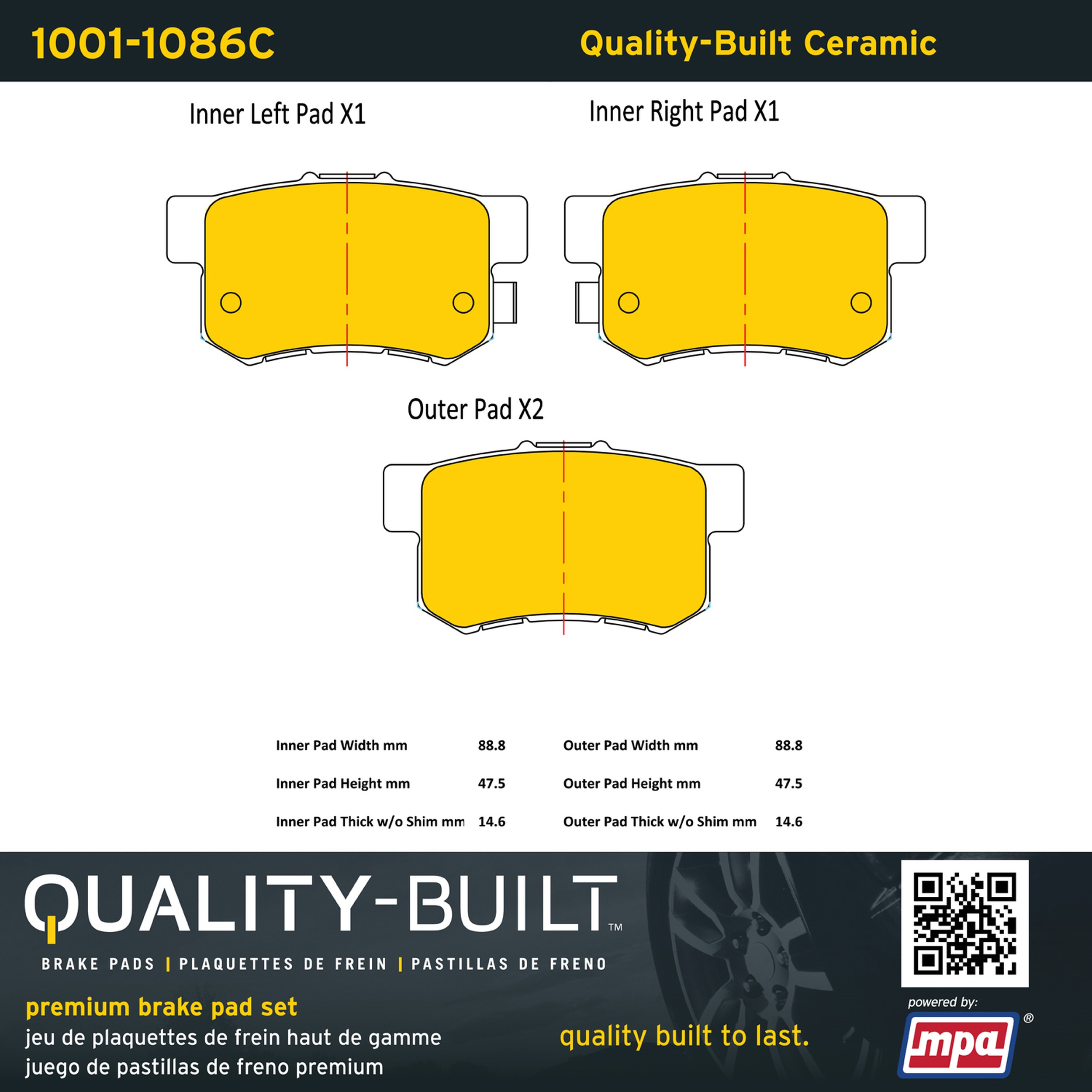 - Quality-Built Premium Brake Pads provide optimized stopping power in all conditions. Application-specific pad formulas remove the guesswork from pad selection by providing friction compounds engineered to restore like-new stopping power for every vehicle. 2025 compliant, copper-free friction formulas deliver dependable performance across a wide thermal range with low brake dust and zero noise.