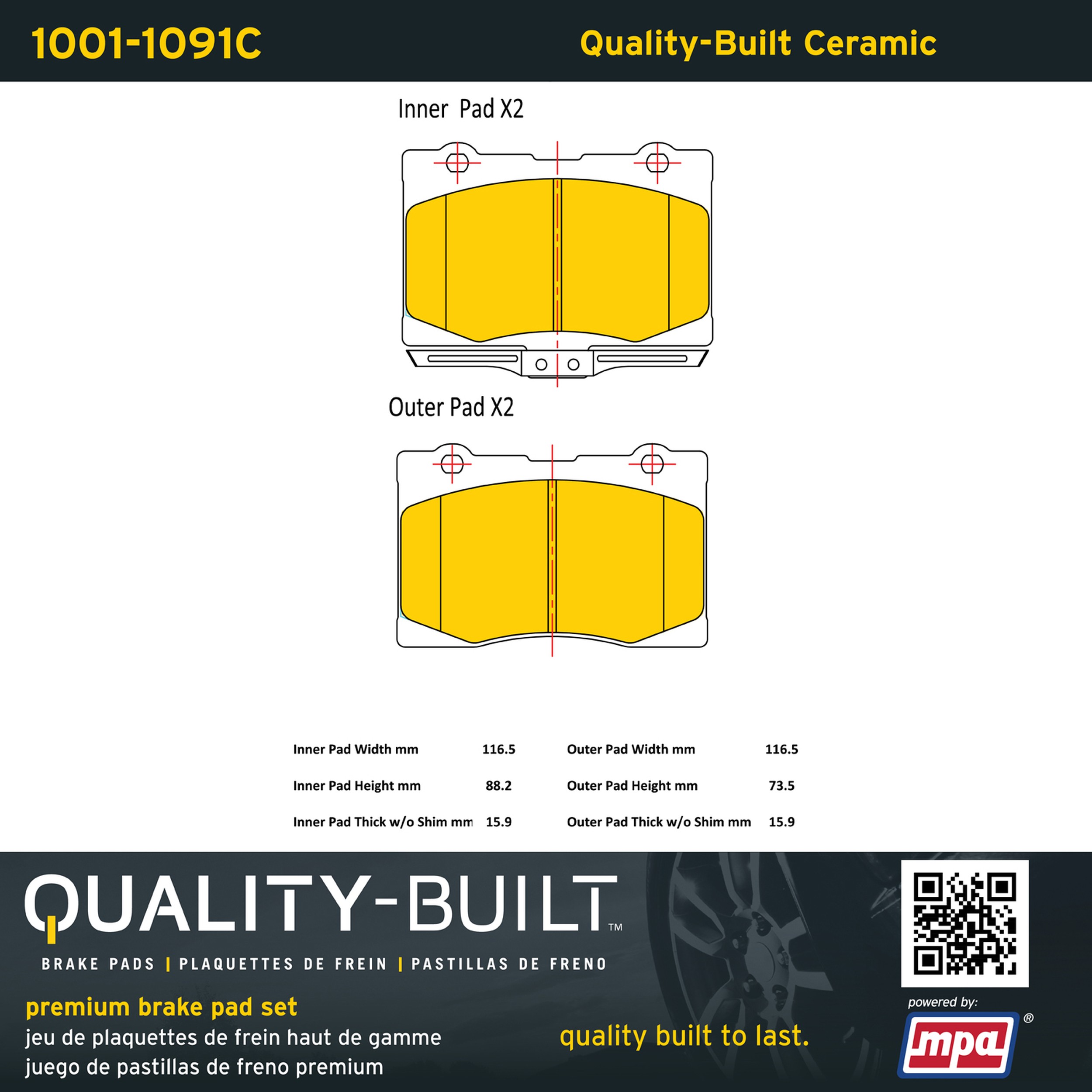 - Quality-Built Premium Brake Pads provide optimized stopping power in all conditions. Application-specific pad formulas remove the guesswork from pad selection by providing friction compounds engineered to restore like-new stopping power for every vehicle. 2025 compliant, copper-free friction formulas deliver dependable performance across a wide thermal range with low brake dust and zero noise.