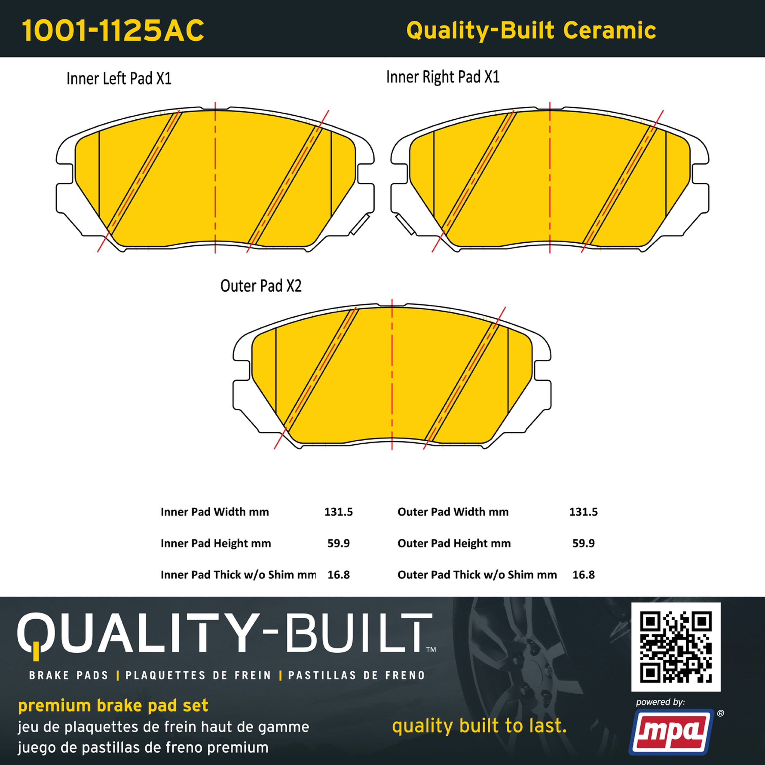 - Quality-Built Premium Brake Pads provide optimized stopping power in all conditions. Application-specific pad formulas remove the guesswork from pad selection by providing friction compounds engineered to restore like-new stopping power for every vehicle. 2025 compliant, copper-free friction formulas deliver dependable performance across a wide thermal range with low brake dust and zero noise.