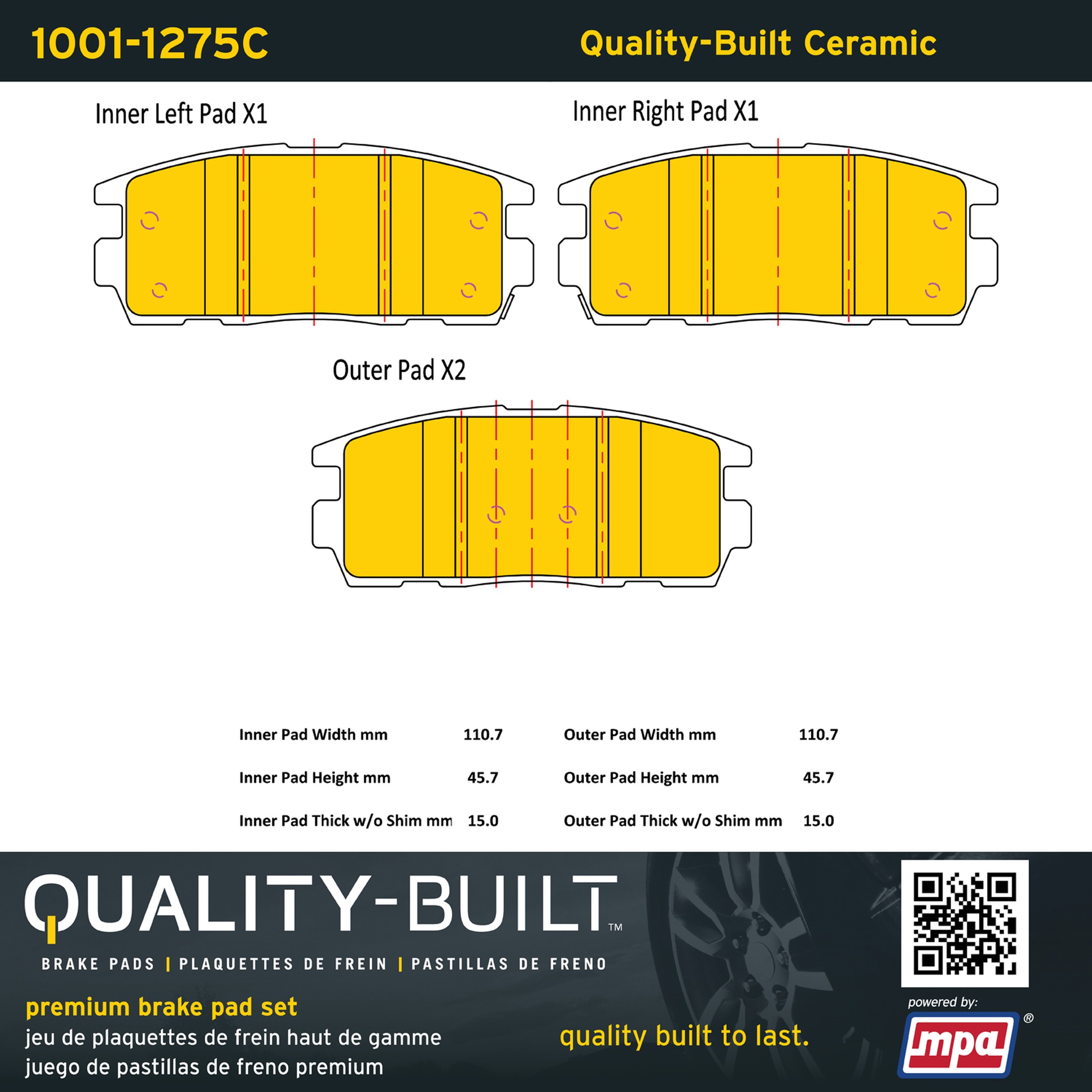 - Quality-Built Premium Brake Pads provide optimized stopping power in all conditions. Application-specific pad formulas remove the guesswork from pad selection by providing friction compounds engineered to restore like-new stopping power for every vehicle. 2025 compliant, copper-free friction formulas deliver dependable performance across a wide thermal range with low brake dust and zero noise.