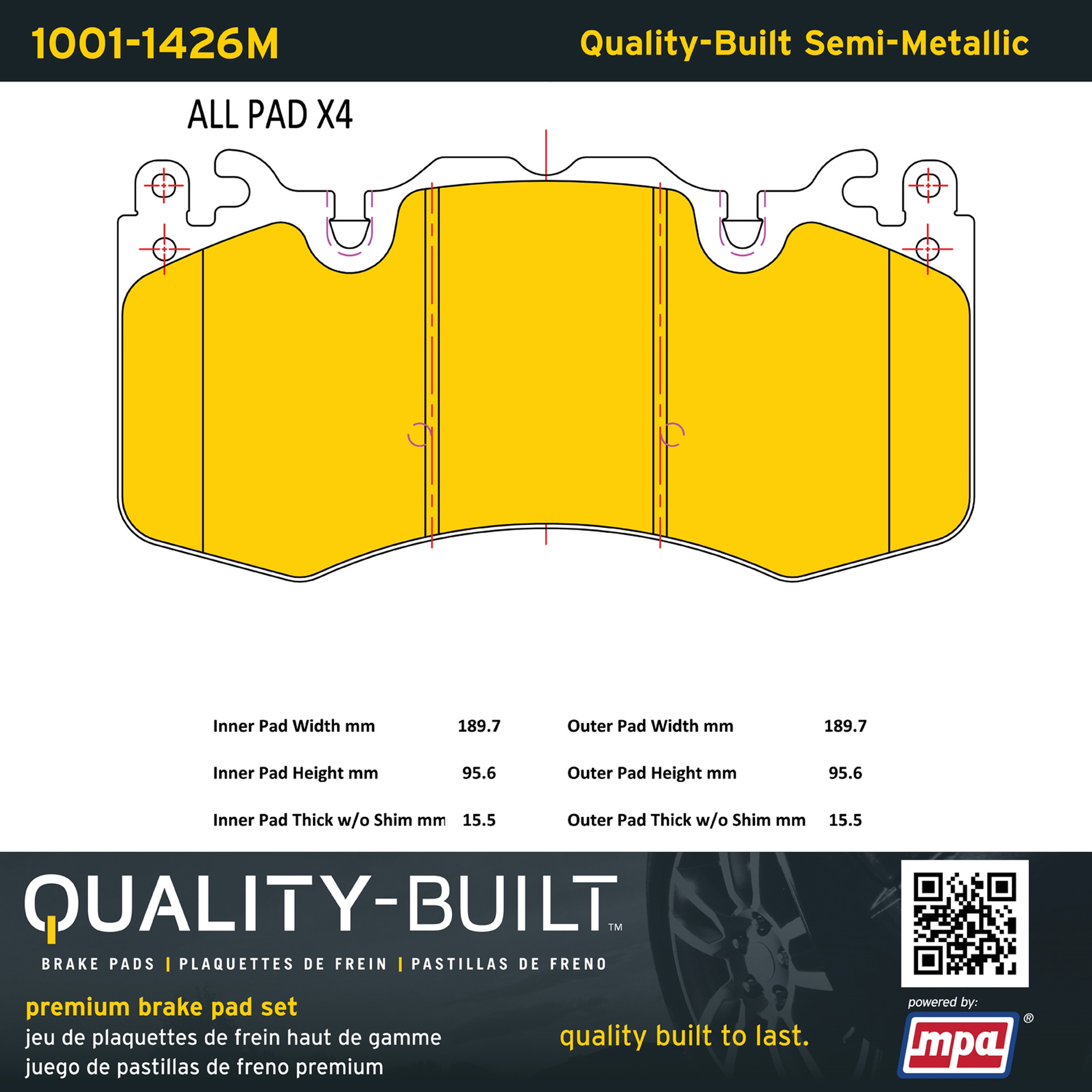 - Quality-Built Premium Brake Pads provide optimized stopping power in all conditions. Application-specific pad formulas remove the guesswork from pad selection by providing friction compounds engineered to restore like-new stopping power for every vehicle. 2025 compliant, copper-free friction formulas deliver dependable performance across a wide thermal range with low brake dust and zero noise.