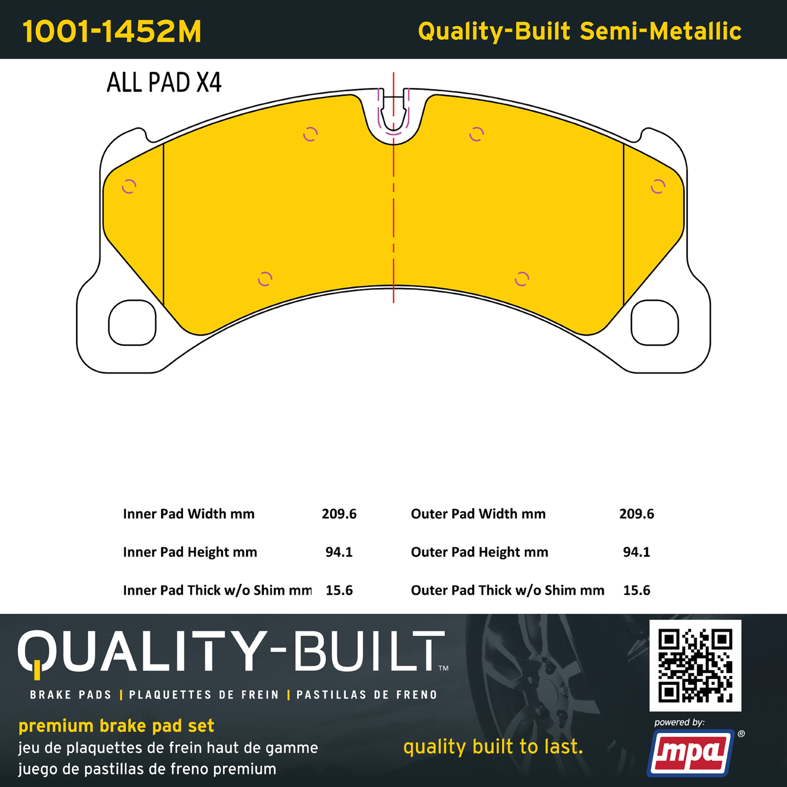 - Quality-Built Premium Brake Pads provide optimized stopping power in all conditions. Application-specific pad formulas remove the guesswork from pad selection by providing friction compounds engineered to restore like-new stopping power for every vehicle. 2025 compliant, copper-free friction formulas deliver dependable performance across a wide thermal range with low brake dust and zero noise.