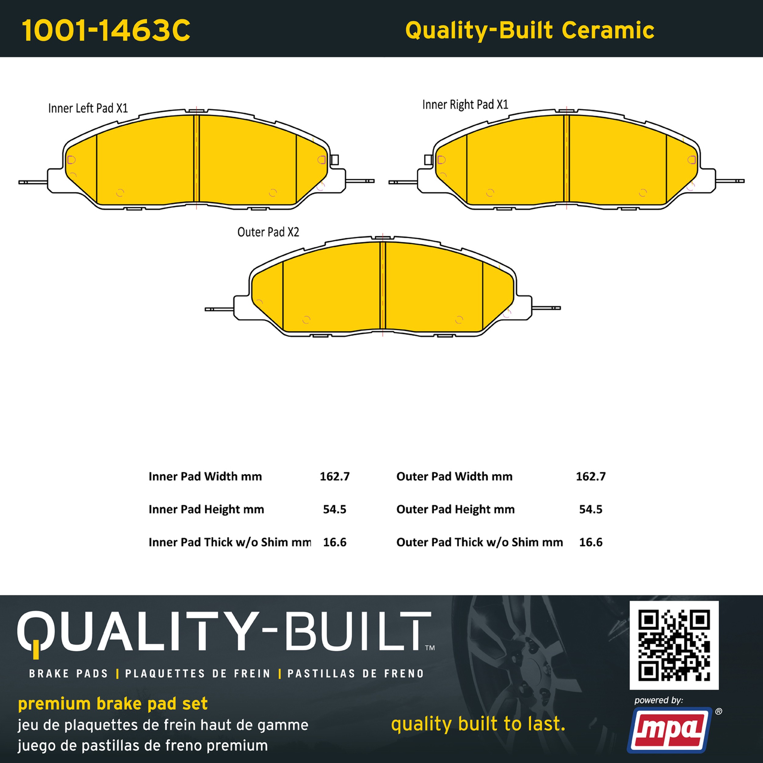 - Quality-Built Premium Brake Pads provide optimized stopping power in all conditions. Application-specific pad formulas remove the guesswork from pad selection by providing friction compounds engineered to restore like-new stopping power for every vehicle. 2025 compliant, copper-free friction formulas deliver dependable performance across a wide thermal range with low brake dust and zero noise.