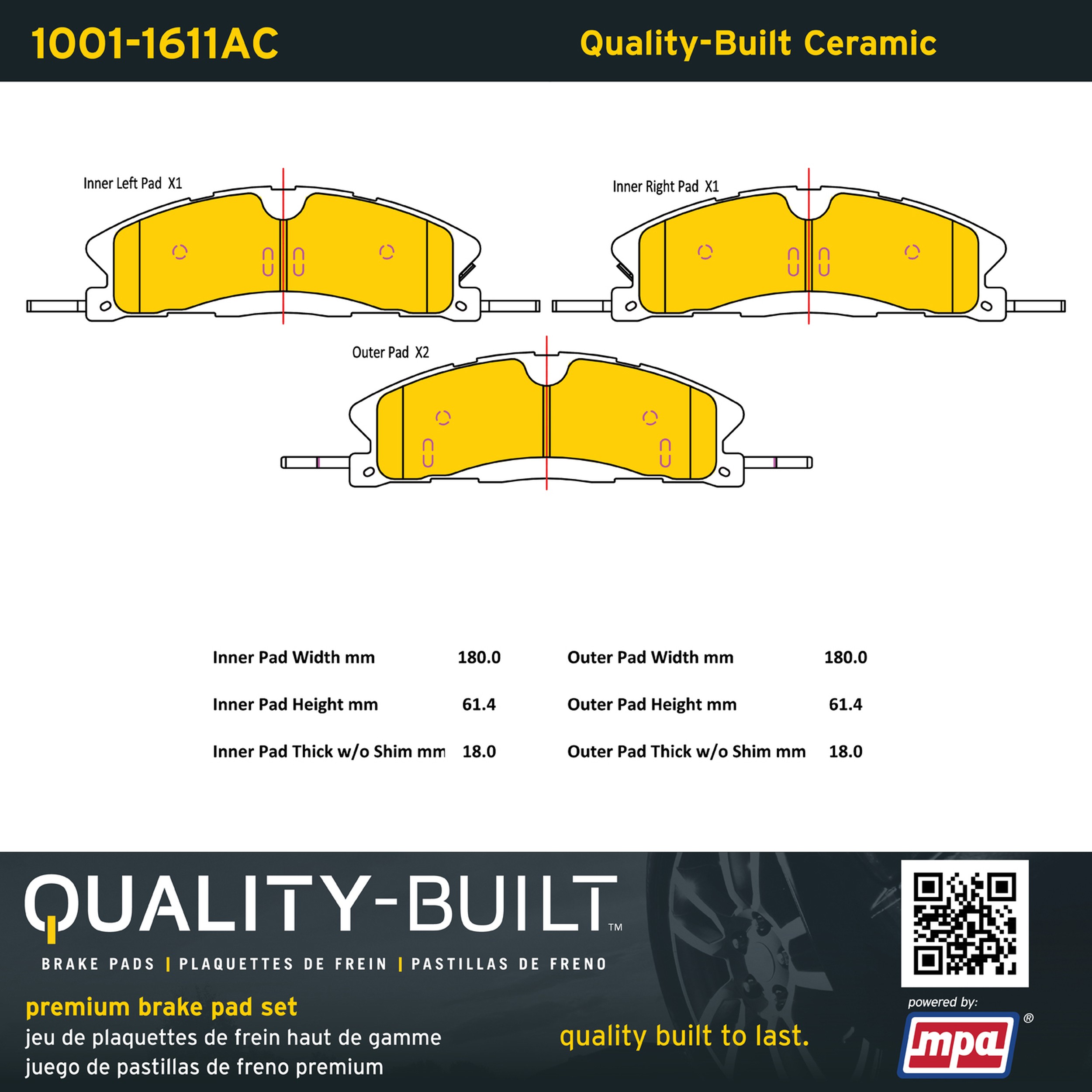 - Quality-Built Premium Brake Pads provide optimized stopping power in all conditions. Application-specific pad formulas remove the guesswork from pad selection by providing friction compounds engineered to restore like-new stopping power for every vehicle. 2025 compliant, copper-free friction formulas deliver dependable performance across a wide thermal range with low brake dust and zero noise.