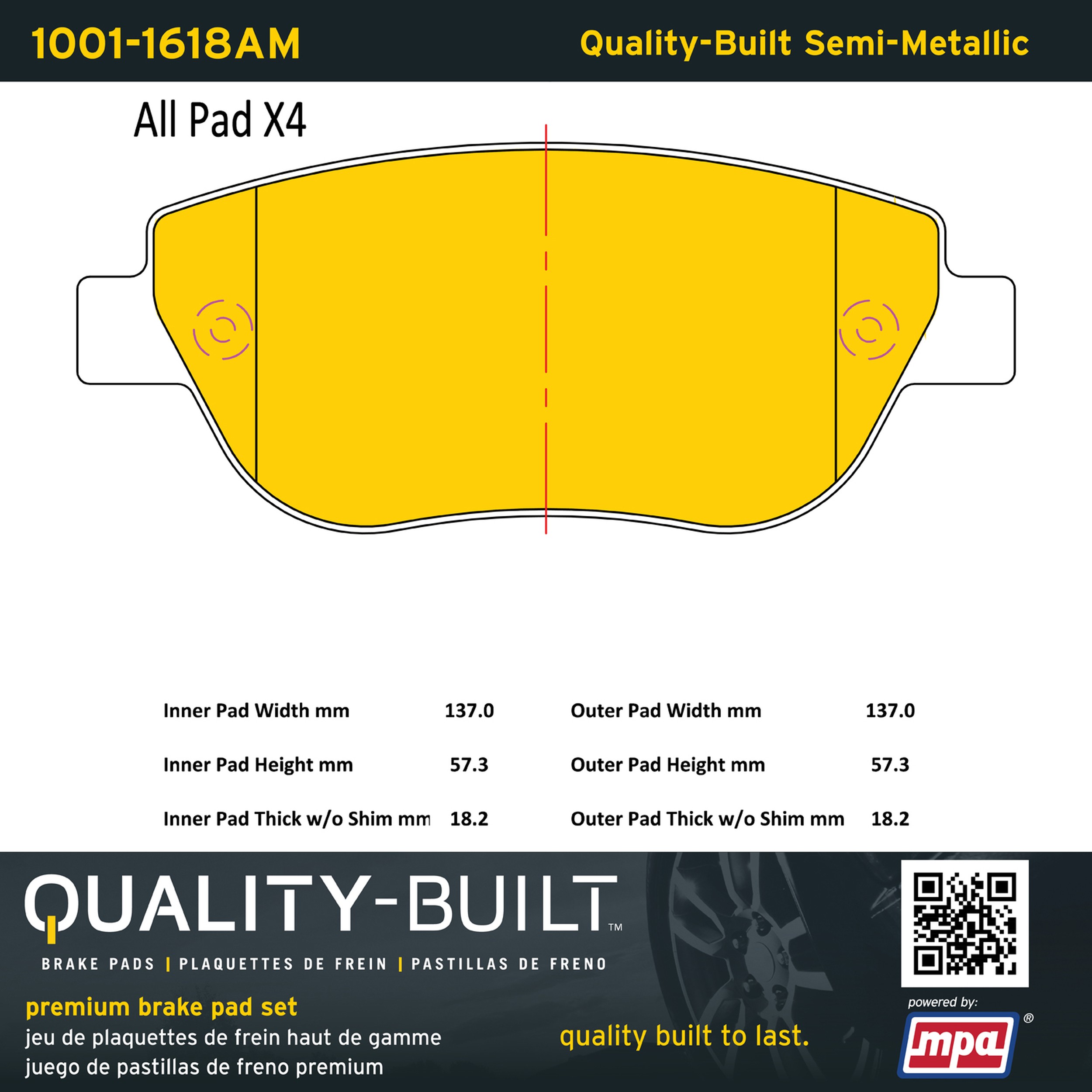 - Quality-Built Premium Brake Pads provide optimized stopping power in all conditions. Application-specific pad formulas remove the guesswork from pad selection by providing friction compounds engineered to restore like-new stopping power for every vehicle. 2025 compliant, copper-free friction formulas deliver dependable performance across a wide thermal range with low brake dust and zero noise.