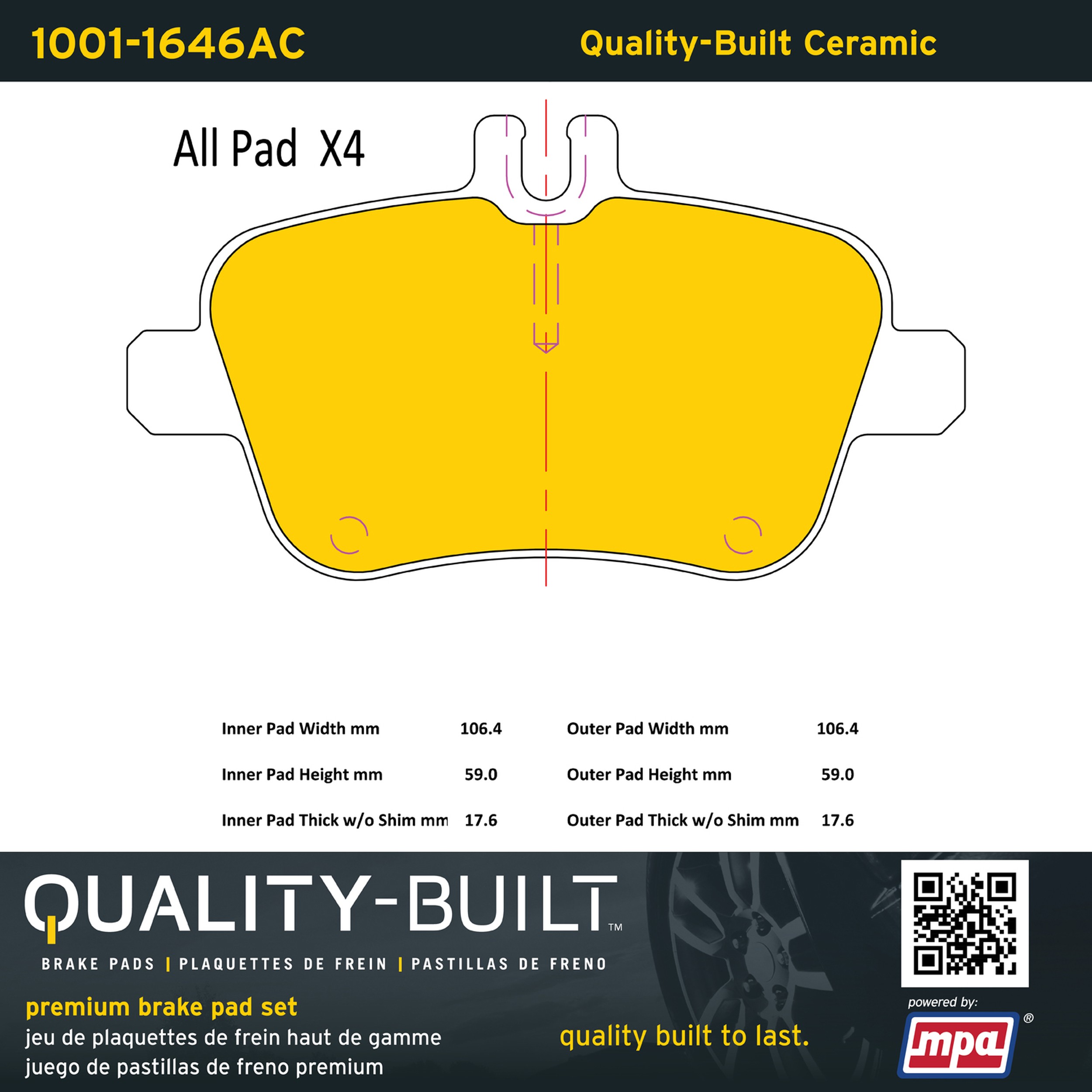 - Quality-Built Premium Brake Pads provide optimized stopping power in all conditions. Application-specific pad formulas remove the guesswork from pad selection by providing friction compounds engineered to restore like-new stopping power for every vehicle. 2025 compliant, copper-free friction formulas deliver dependable performance across a wide thermal range with low brake dust and zero noise.