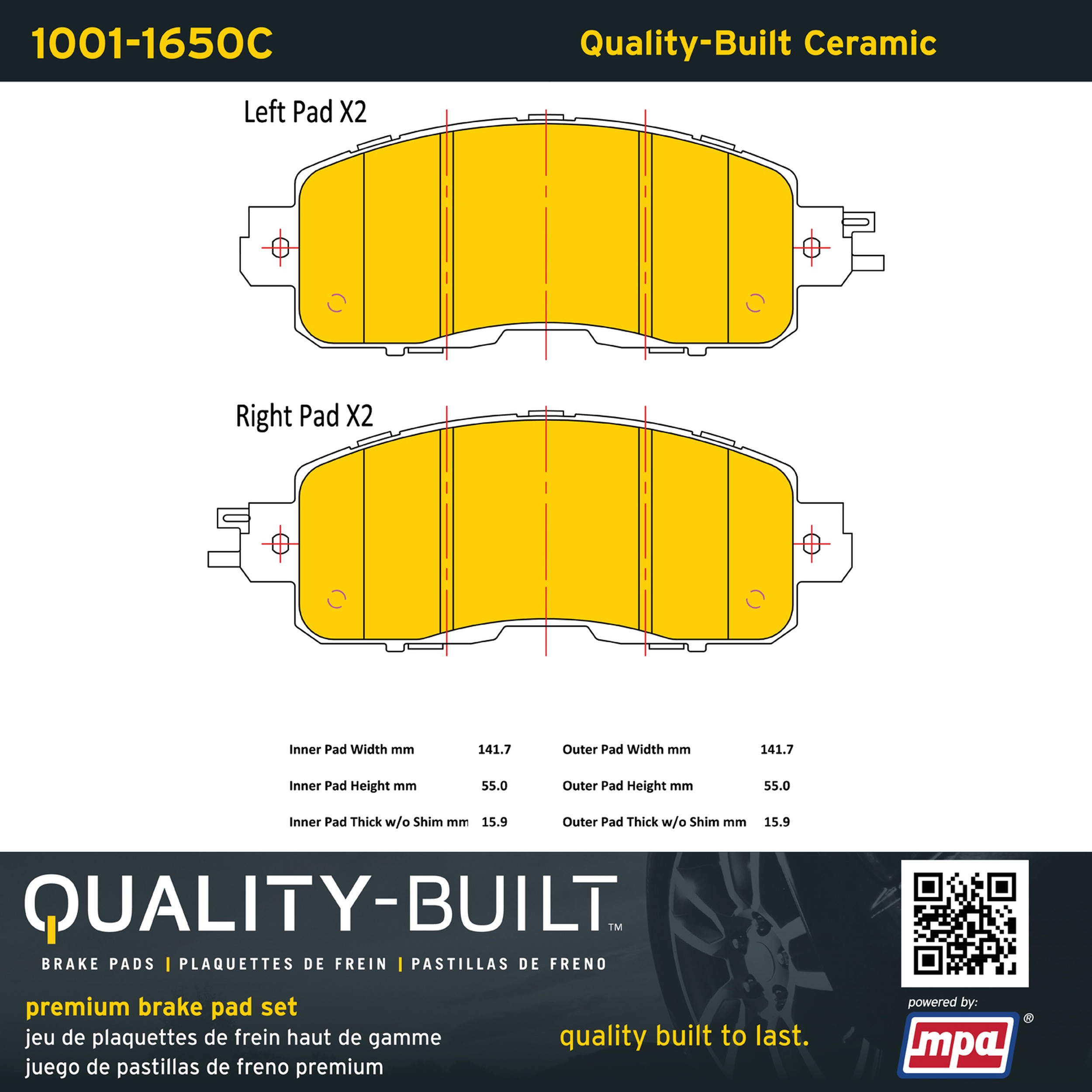- Quality-Built Premium Brake Pads provide optimized stopping power in all conditions. Application-specific pad formulas remove the guesswork from pad selection by providing friction compounds engineered to restore like-new stopping power for every vehicle. 2025 compliant, copper-free friction formulas deliver dependable performance across a wide thermal range with low brake dust and zero noise.