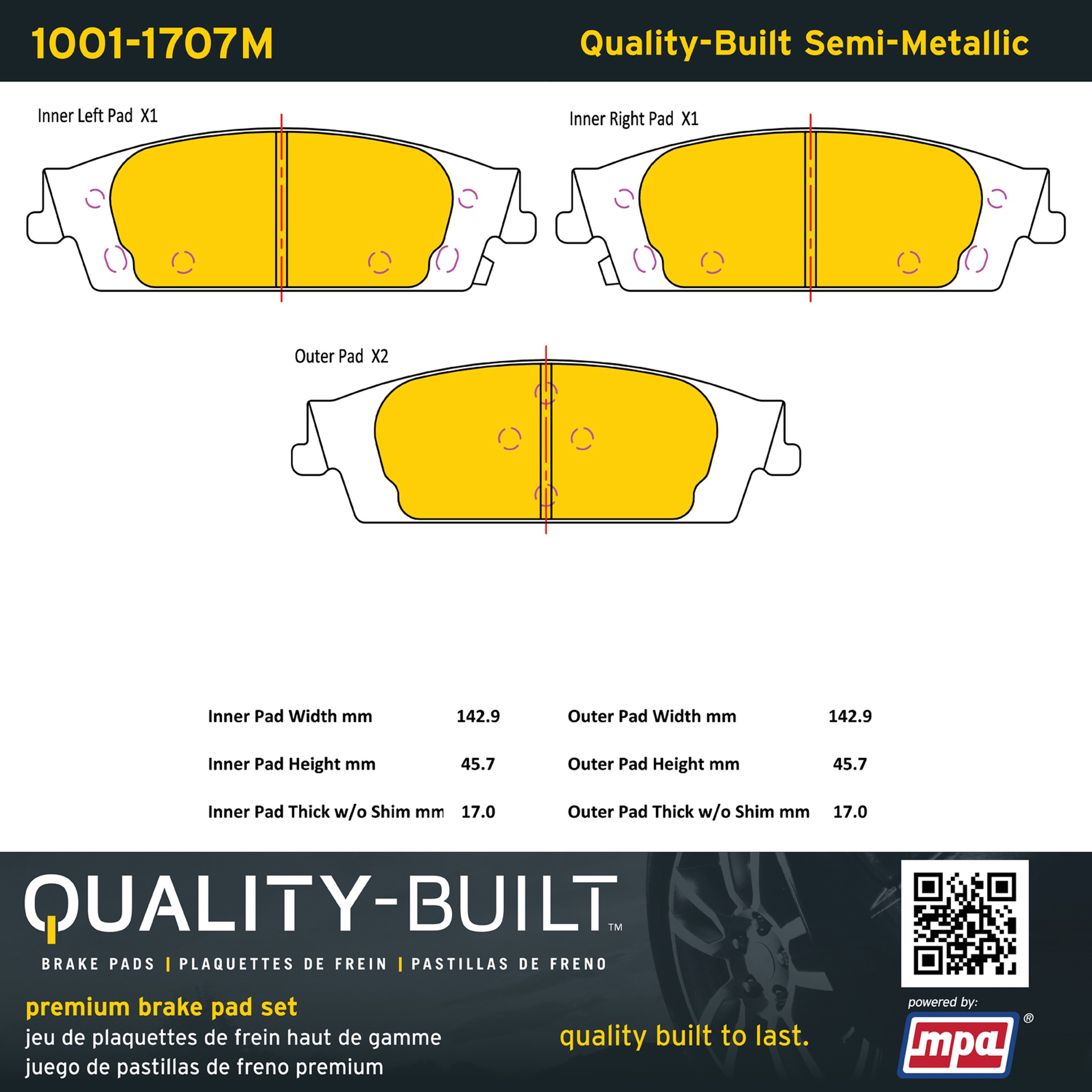 - Quality-Built Premium Brake Pads provide optimized stopping power in all conditions. Application-specific pad formulas remove the guesswork from pad selection by providing friction compounds engineered to restore like-new stopping power for every vehicle. 2025 compliant, copper-free friction formulas deliver dependable performance across a wide thermal range with low brake dust and zero noise.