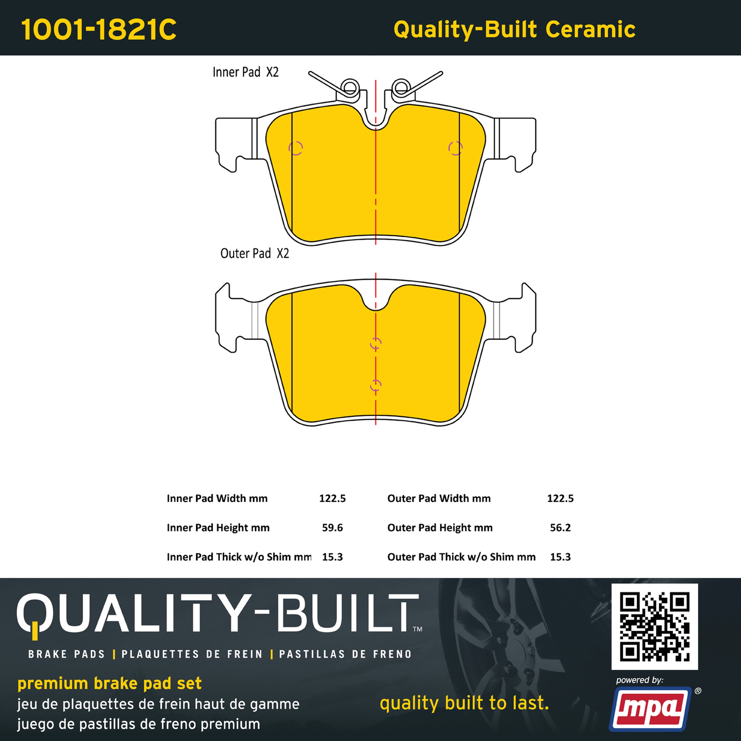 - Quality-Built Premium Brake Pads provide optimized stopping power in all conditions. Application-specific pad formulas remove the guesswork from pad selection by providing friction compounds engineered to restore like-new stopping power for every vehicle. 2025 compliant, copper-free friction formulas deliver dependable performance across a wide thermal range with low brake dust and zero noise.