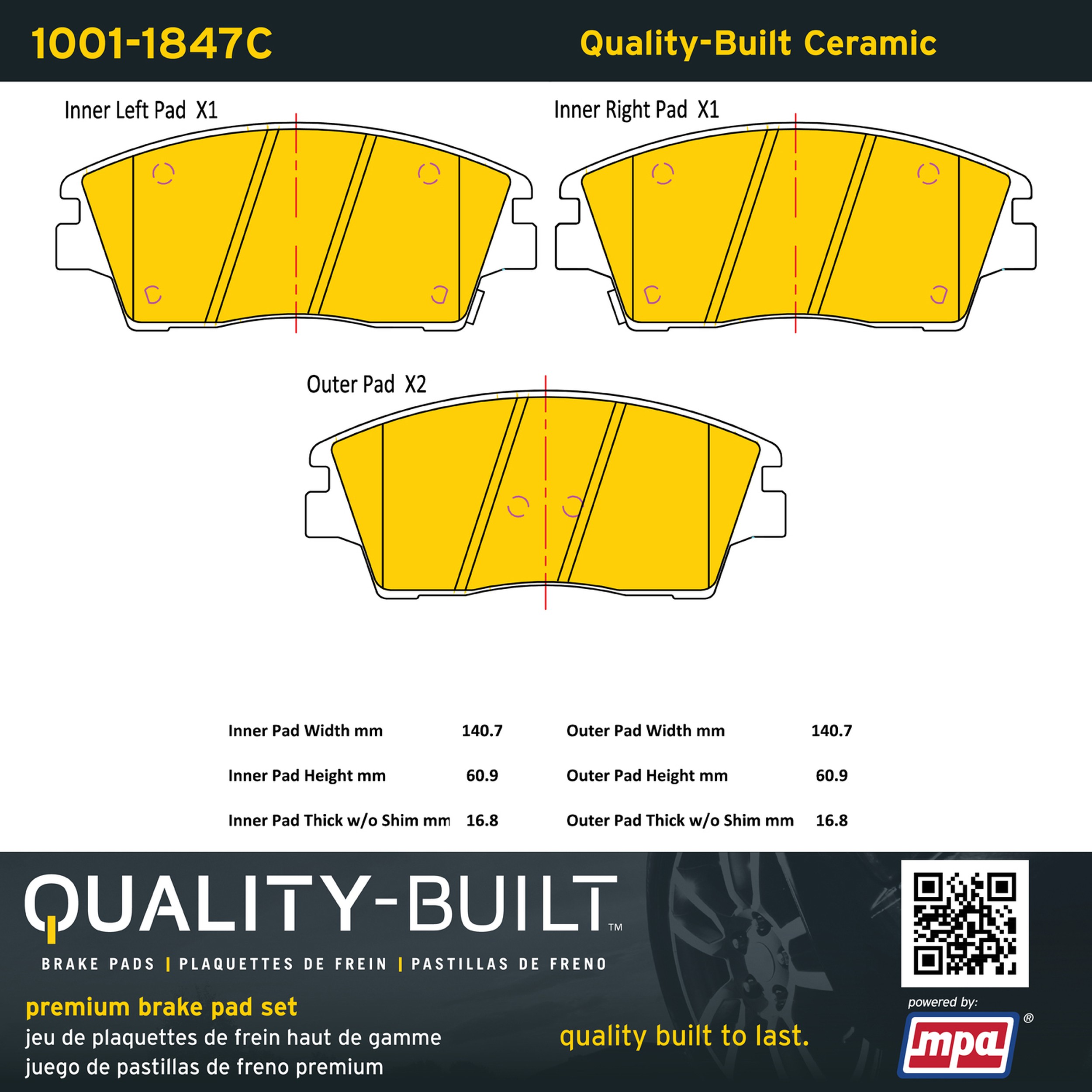 - Quality-Built Premium Brake Pads provide optimized stopping power in all conditions. Application-specific pad formulas remove the guesswork from pad selection by providing friction compounds engineered to restore like-new stopping power for every vehicle. 2025 compliant, copper-free friction formulas deliver dependable performance across a wide thermal range with low brake dust and zero noise.