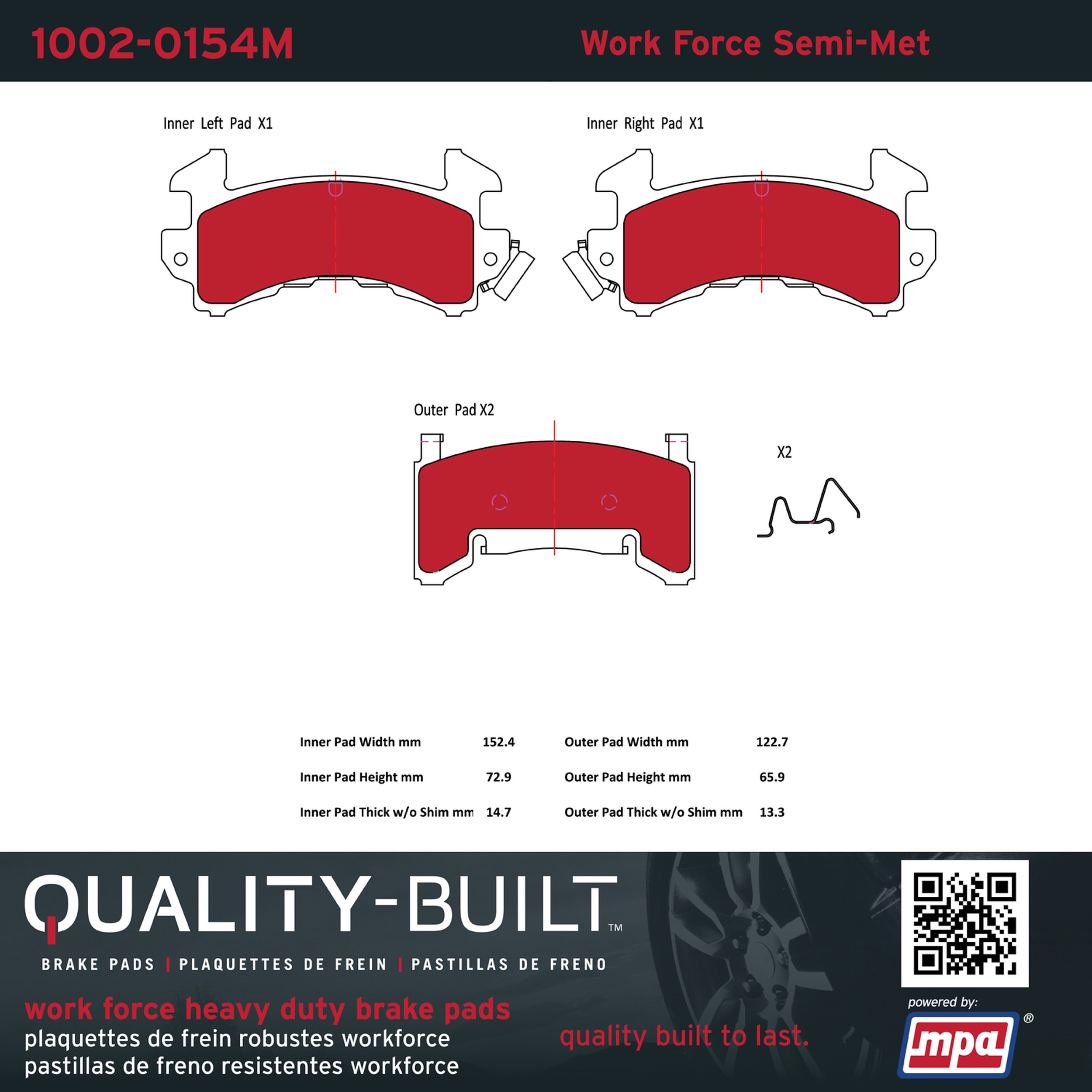 - Hardworking vehicles need hardworking brake pads, and Quality-Built Work force brake pads deliver every time. Specially formulated friction compounds are designed for high heat, heavy-duty use, where repeat stop situations, off-road driving, or towing push brake pads to the limits. Work force brake pads are an excellent choice for fleet use where extended service life and maximum durability are required.