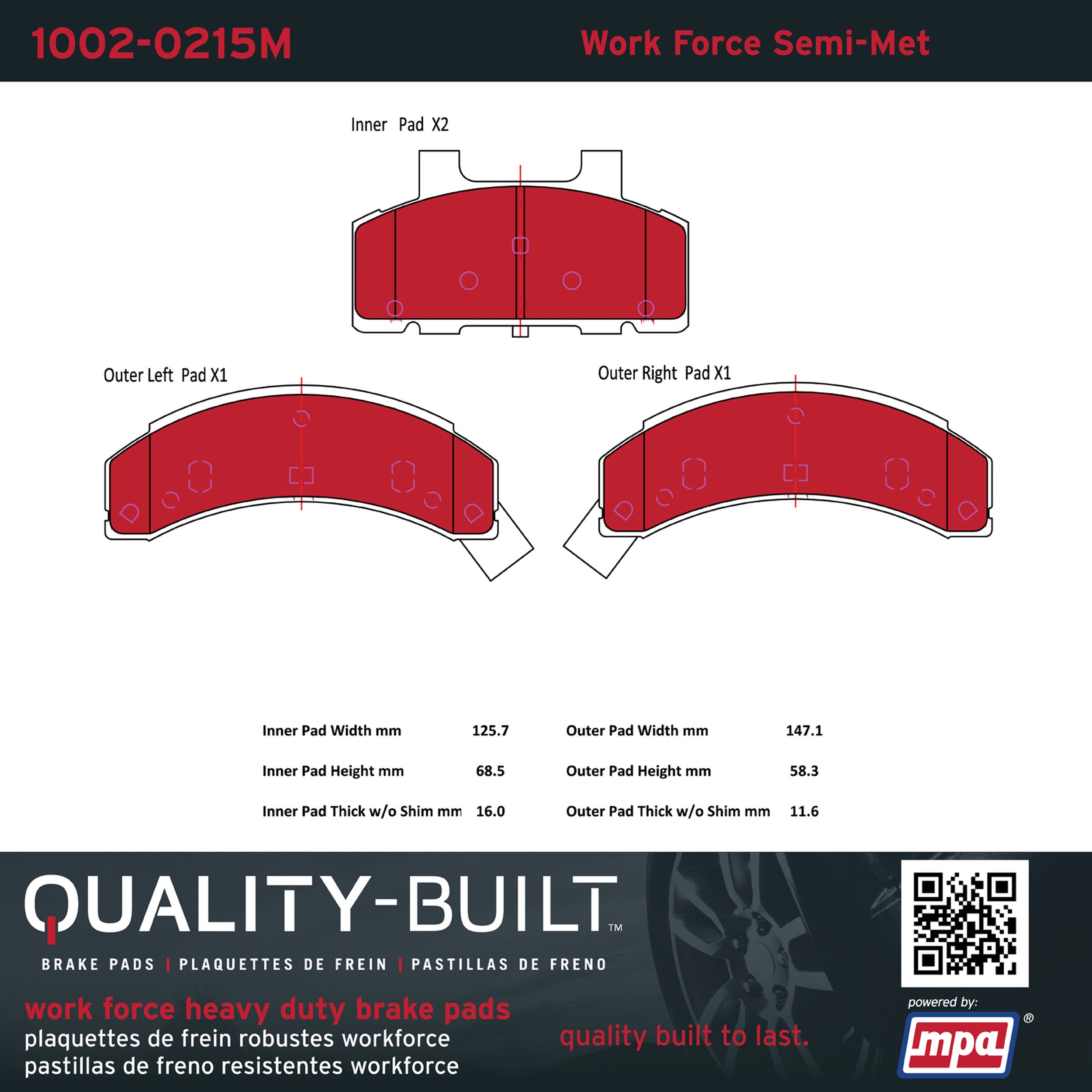 - Hardworking vehicles need hardworking brake pads, and Quality-Built Work force brake pads deliver every time. Specially formulated friction compounds are designed for high heat, heavy-duty use, where repeat stop situations, off-road driving, or towing push brake pads to the limits. Work force brake pads are an excellent choice for fleet use where extended service life and maximum durability are required.