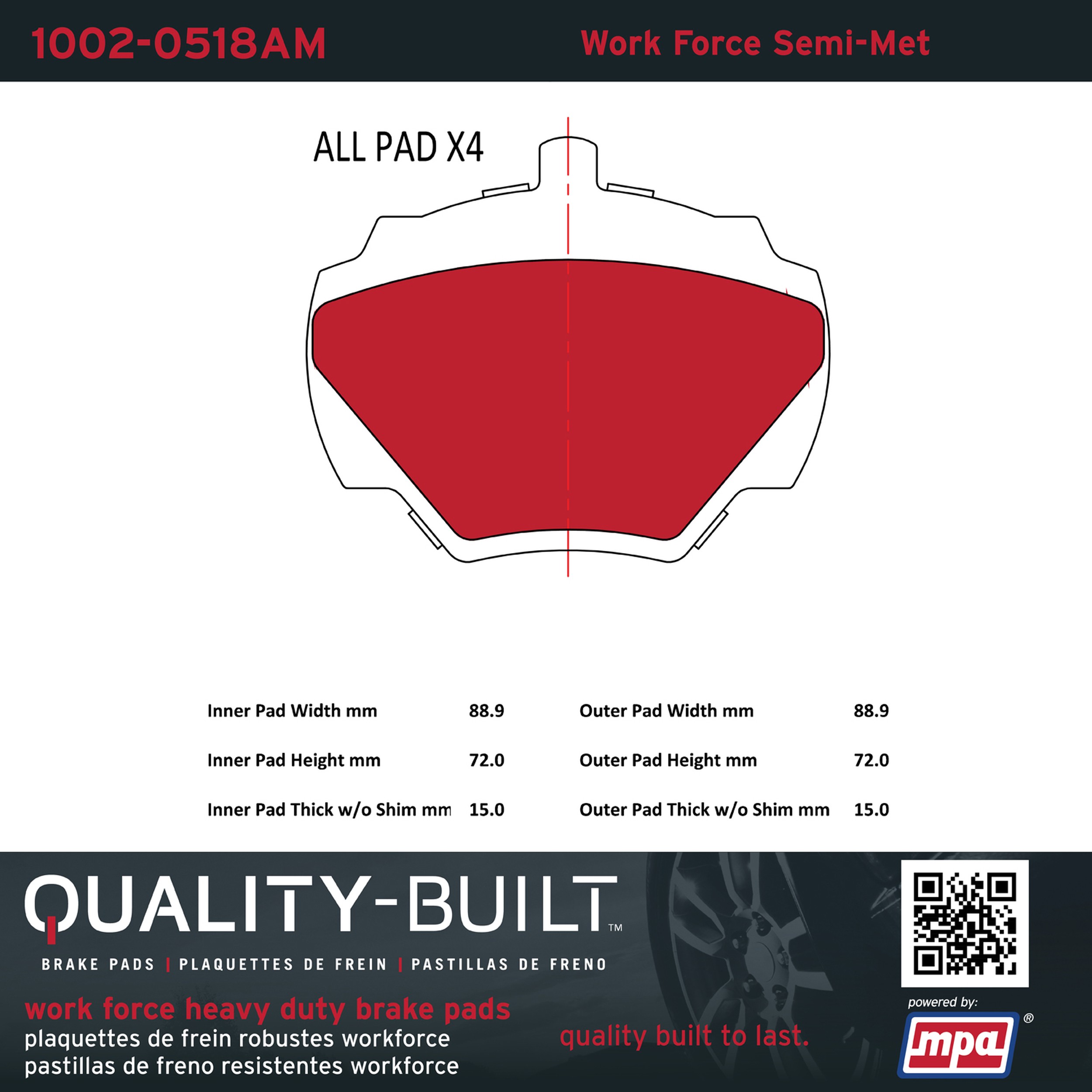 - Hardworking vehicles need hardworking brake pads, and Quality-Built Work force brake pads deliver every time. Specially formulated friction compounds are designed for high heat, heavy-duty use, where repeat stop situations, off-road driving, or towing push brake pads to the limits. Work force brake pads are an excellent choice for fleet use where extended service life and maximum durability are required.