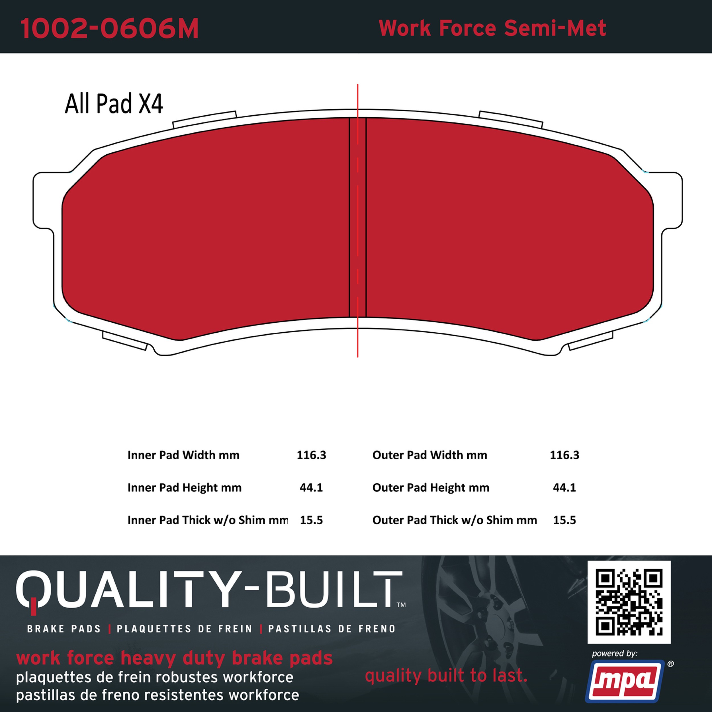 • Hardworking vehicles need hardworking brake pads, and Quality-Built Work force brake pads deliver every time. Specially formulated friction compounds are designed for high heat, heavy-duty use, where repeat stop situations, off-road driving, or towing push brake pads to the limits. Work force brake pads are an excellent choice for fleet use where extended service life and maximum durability are required.