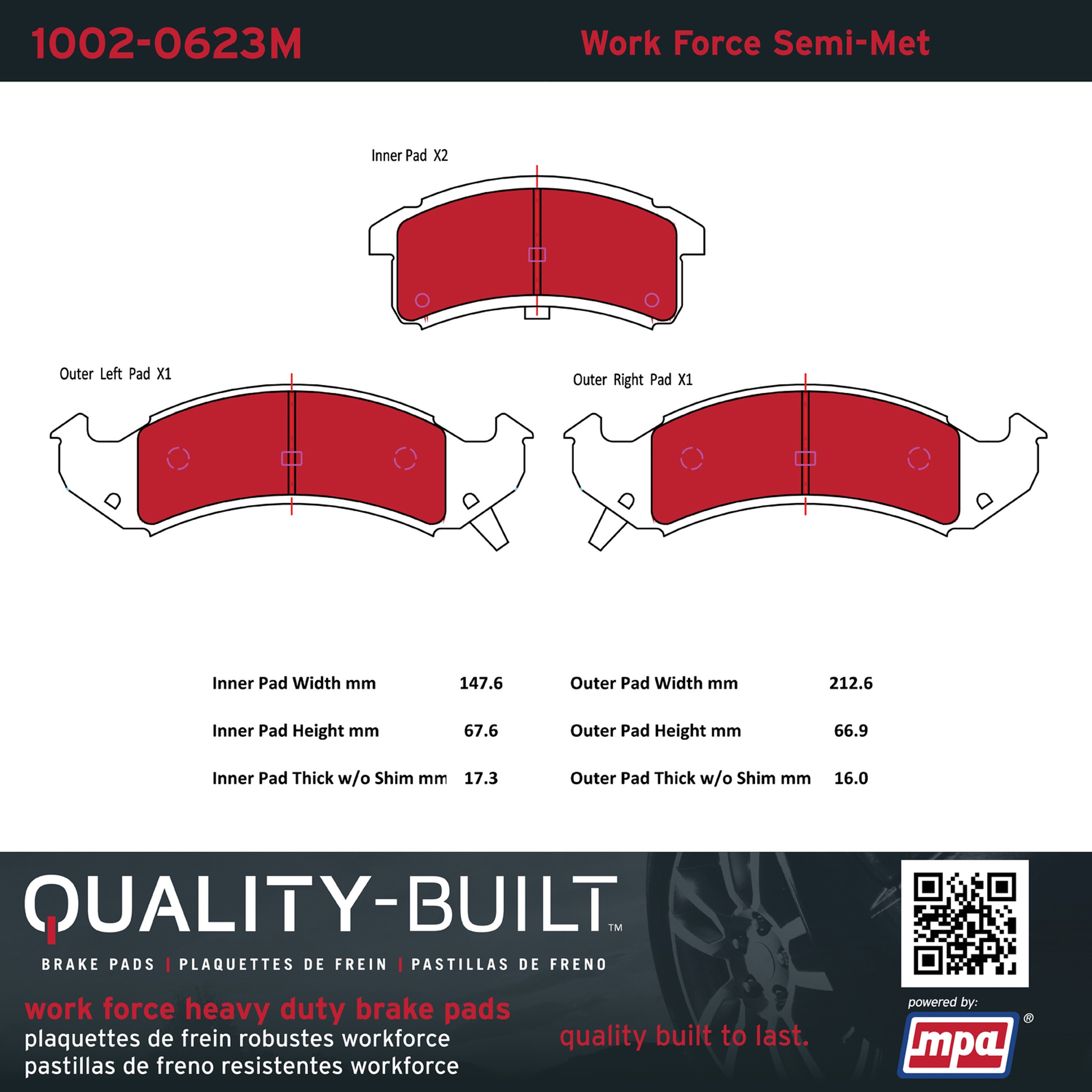 - Hardworking vehicles need hardworking brake pads, and Quality-Built Work force brake pads deliver every time. Specially formulated friction compounds are designed for high heat, heavy-duty use, where repeat stop situations, off-road driving, or towing push brake pads to the limits. Work force brake pads are an excellent choice for fleet use where extended service life and maximum durability are required.