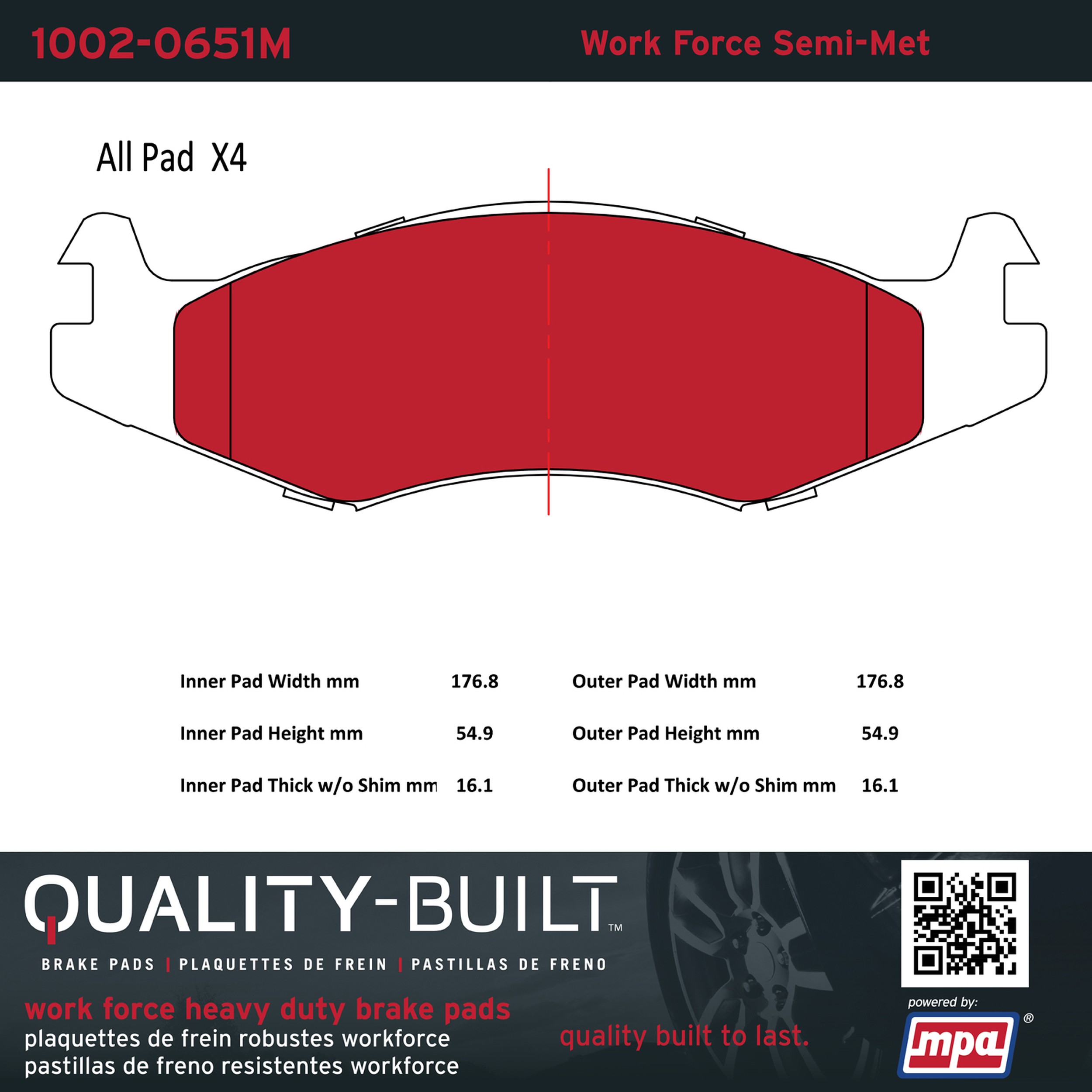 - Hardworking vehicles need hardworking brake pads, and Quality-Built Work force brake pads deliver every time. Specially formulated friction compounds are designed for high heat, heavy-duty use, where repeat stop situations, off-road driving, or towing push brake pads to the limits. Work force brake pads are an excellent choice for fleet use where extended service life and maximum durability are required.