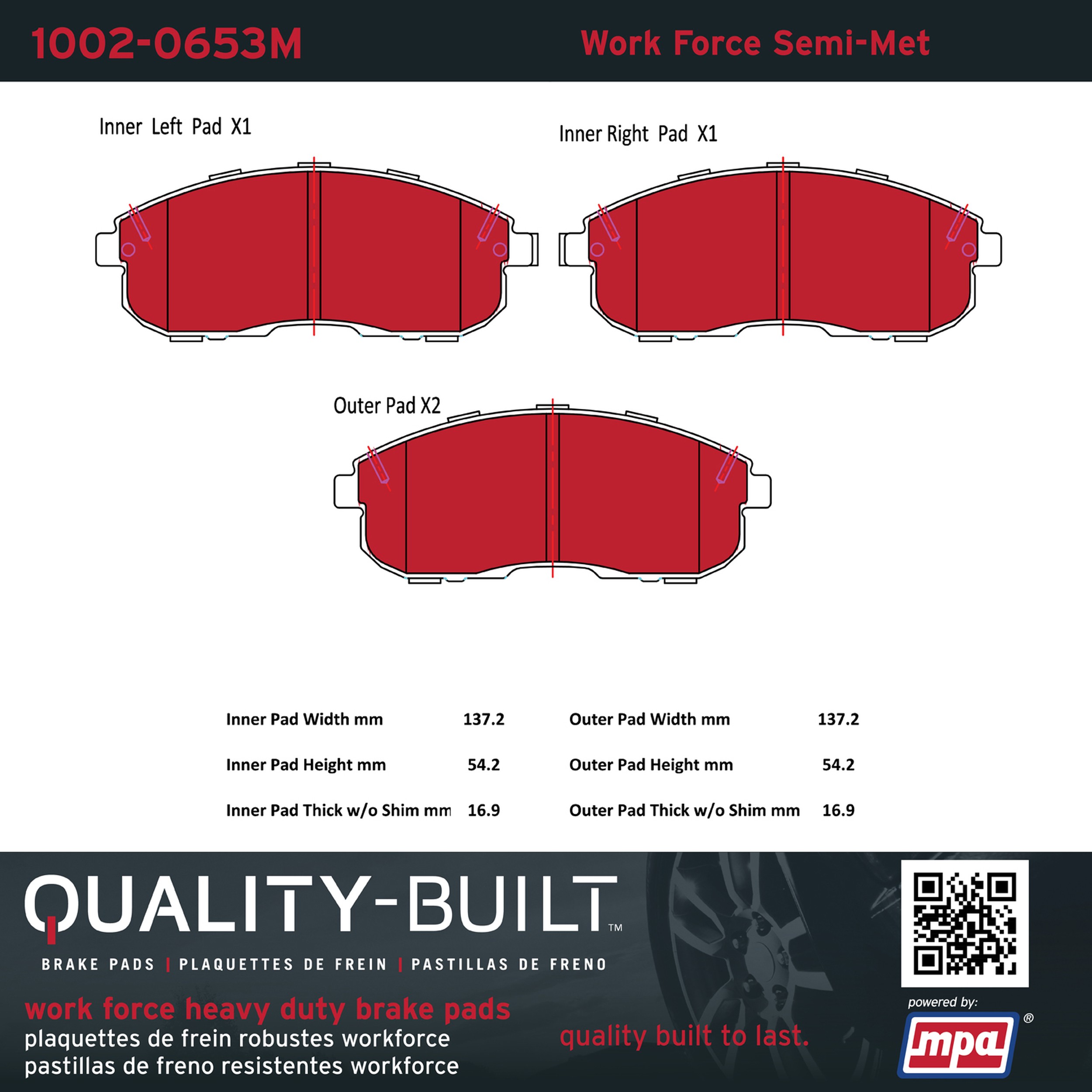 - Hardworking vehicles need hardworking brake pads, and Quality-Built Work force brake pads deliver every time. Specially formulated friction compounds are designed for high heat, heavy-duty use, where repeat stop situations, off-road driving, or towing push brake pads to the limits. Work force brake pads are an excellent choice for fleet use where extended service life and maximum durability are required.