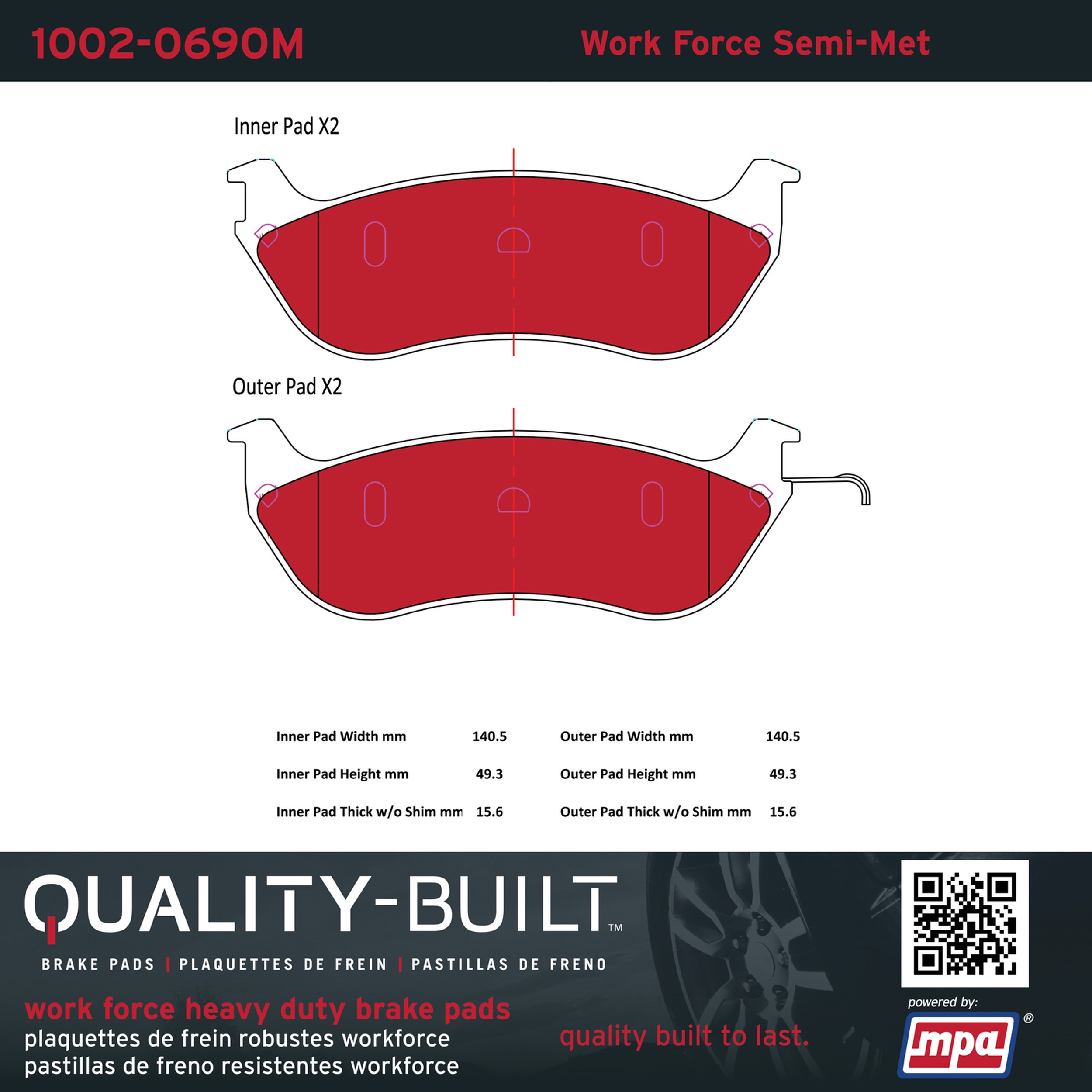 - Hardworking vehicles need hardworking brake pads, and Quality-Built Work force brake pads deliver every time. Specially formulated friction compounds are designed for high heat, heavy-duty use, where repeat stop situations, off-road driving, or towing push brake pads to the limits. Work force brake pads are an excellent choice for fleet use where extended service life and maximum durability are required.