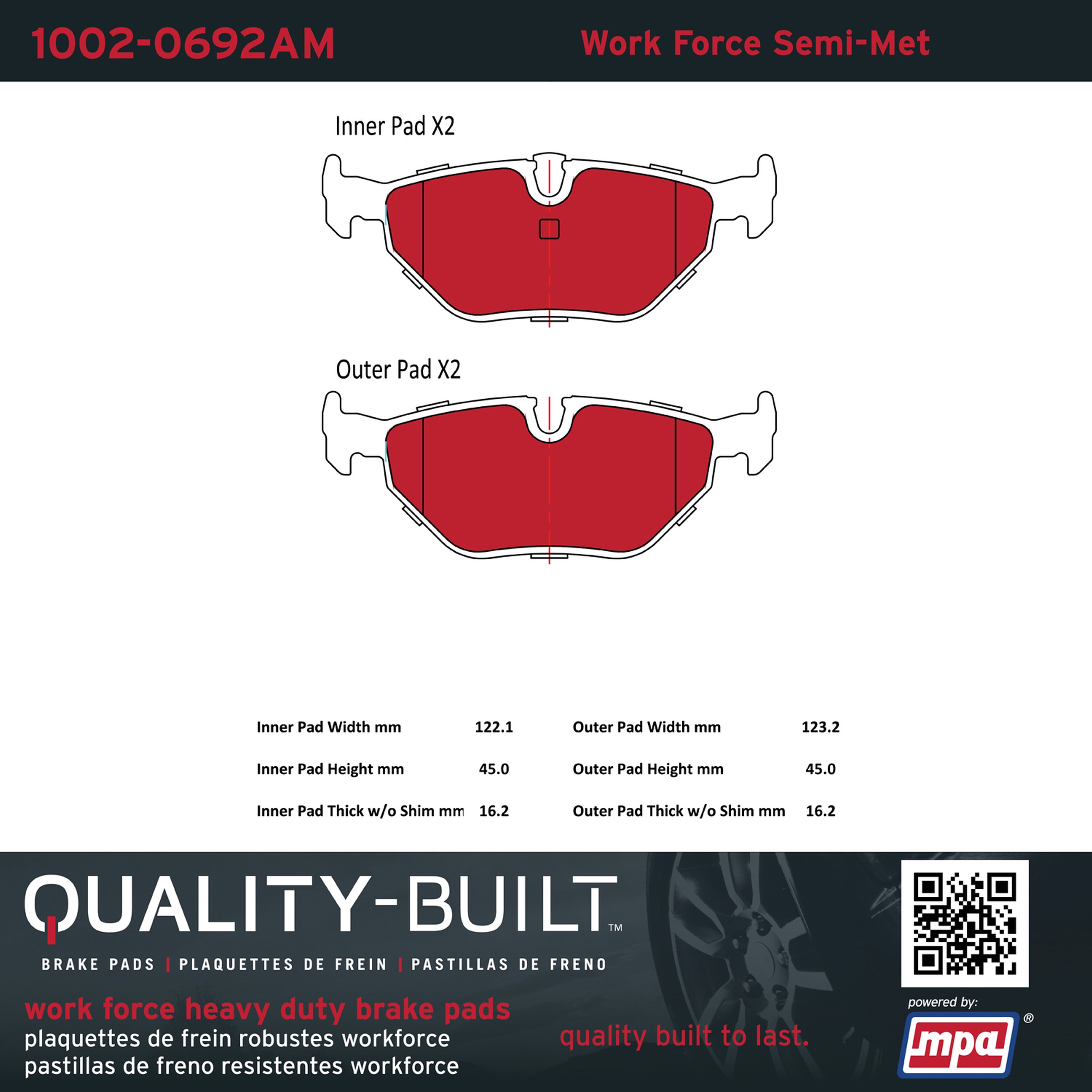 - Hardworking vehicles need hardworking brake pads, and Quality-Built Work force brake pads deliver every time. Specially formulated friction compounds are designed for high heat, heavy-duty use, where repeat stop situations, off-road driving, or towing push brake pads to the limits. Work force brake pads are an excellent choice for fleet use where extended service life and maximum durability are required.