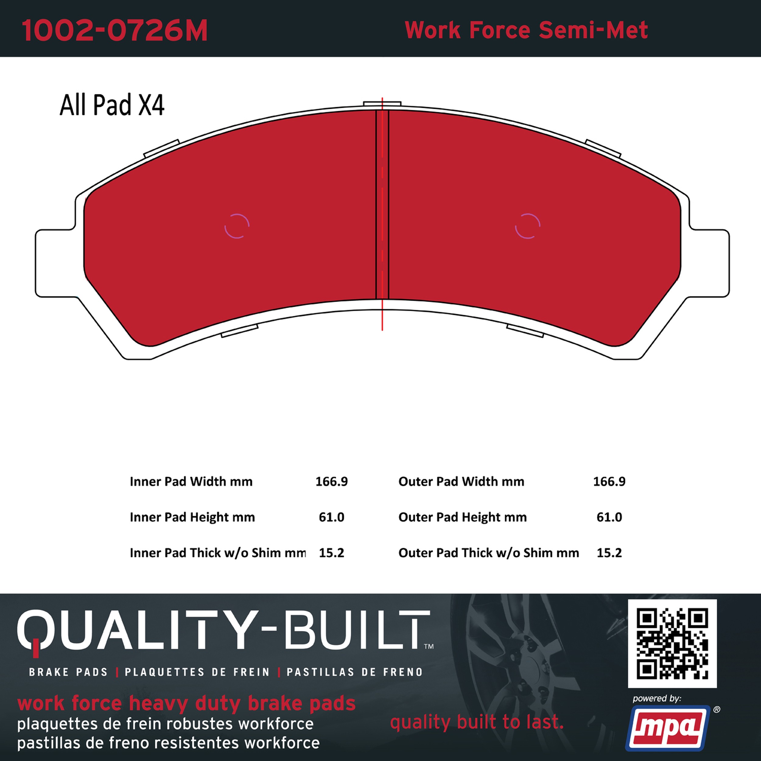 - Hardworking vehicles need hardworking brake pads, and Quality-Built Work force brake pads deliver every time. Specially formulated friction compounds are designed for high heat, heavy-duty use, where repeat stop situations, off-road driving, or towing push brake pads to the limits. Work force brake pads are an excellent choice for fleet use where extended service life and maximum durability are required.