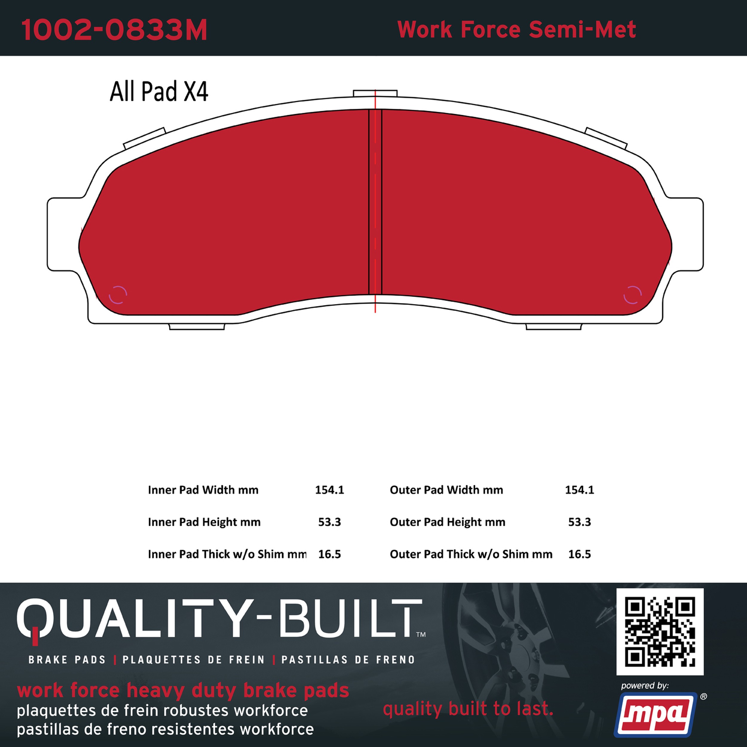 - Hardworking vehicles need hardworking brake pads, and Quality-Built Work force brake pads deliver every time. Specially formulated friction compounds are designed for high heat, heavy-duty use, where repeat stop situations, off-road driving, or towing push brake pads to the limits. Work force brake pads are an excellent choice for fleet use where extended service life and maximum durability are required.