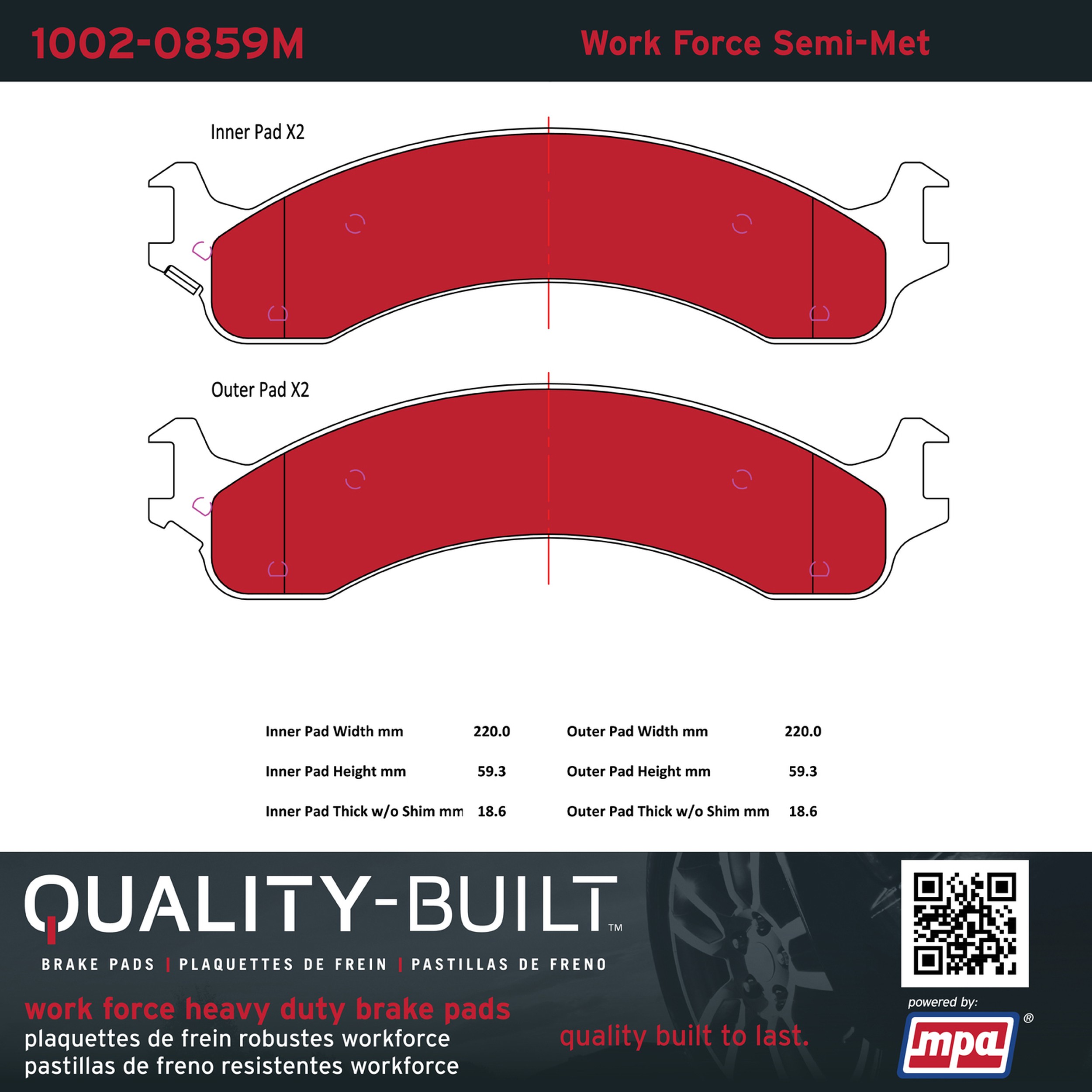 • Hardworking vehicles need hardworking brake pads, and Quality-Built Work force brake pads deliver every time. Specially formulated friction compounds are designed for high heat, heavy-duty use, where repeat stop situations, off-road driving, or towing push brake pads to the limits. Work force brake pads are an excellent choice for fleet use where extended service life and maximum durability are required.