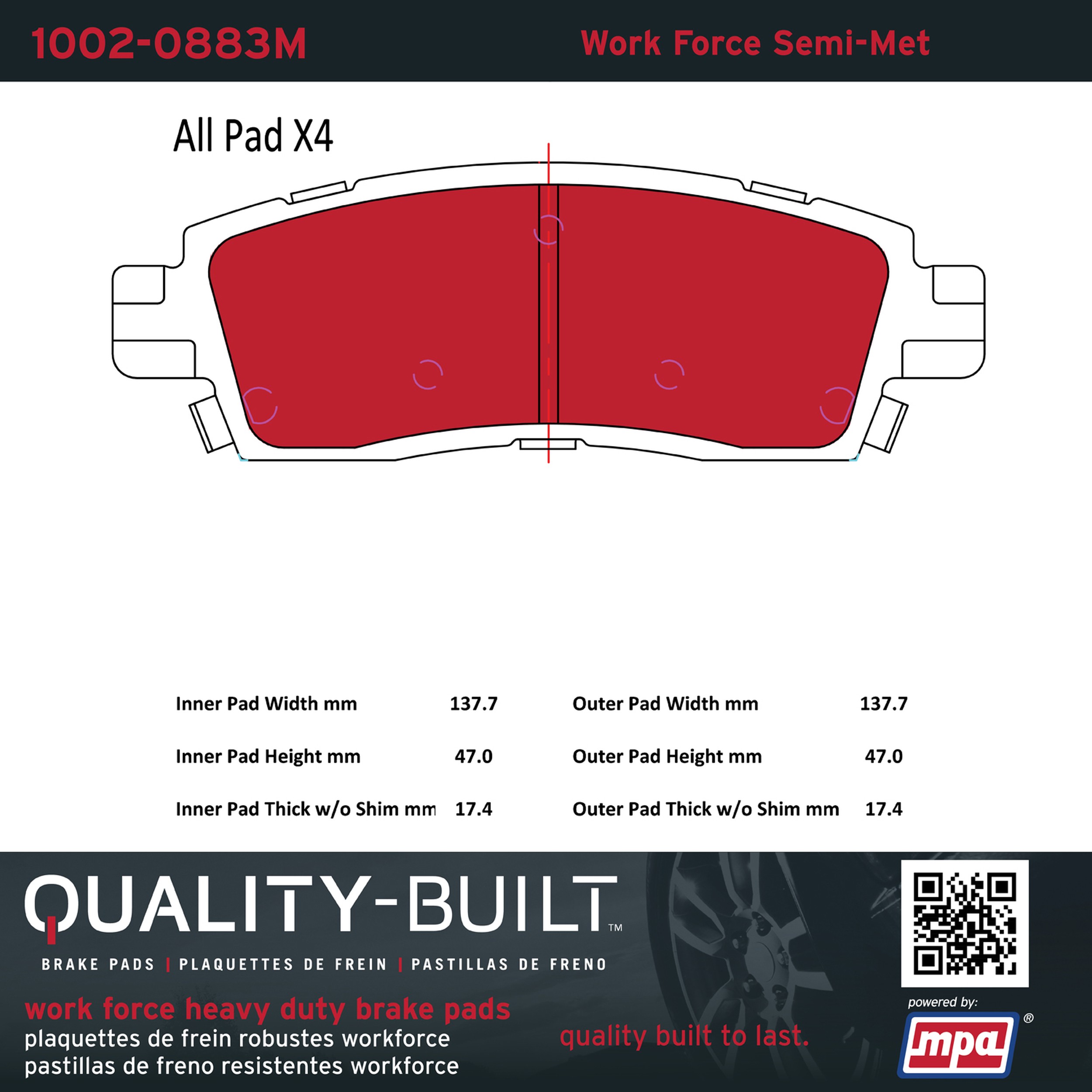 - Hardworking vehicles need hardworking brake pads, and Quality-Built Work force brake pads deliver every time. Specially formulated friction compounds are designed for high heat, heavy-duty use, where repeat stop situations, off-road driving, or towing push brake pads to the limits. Work force brake pads are an excellent choice for fleet use where extended service life and maximum durability are required.