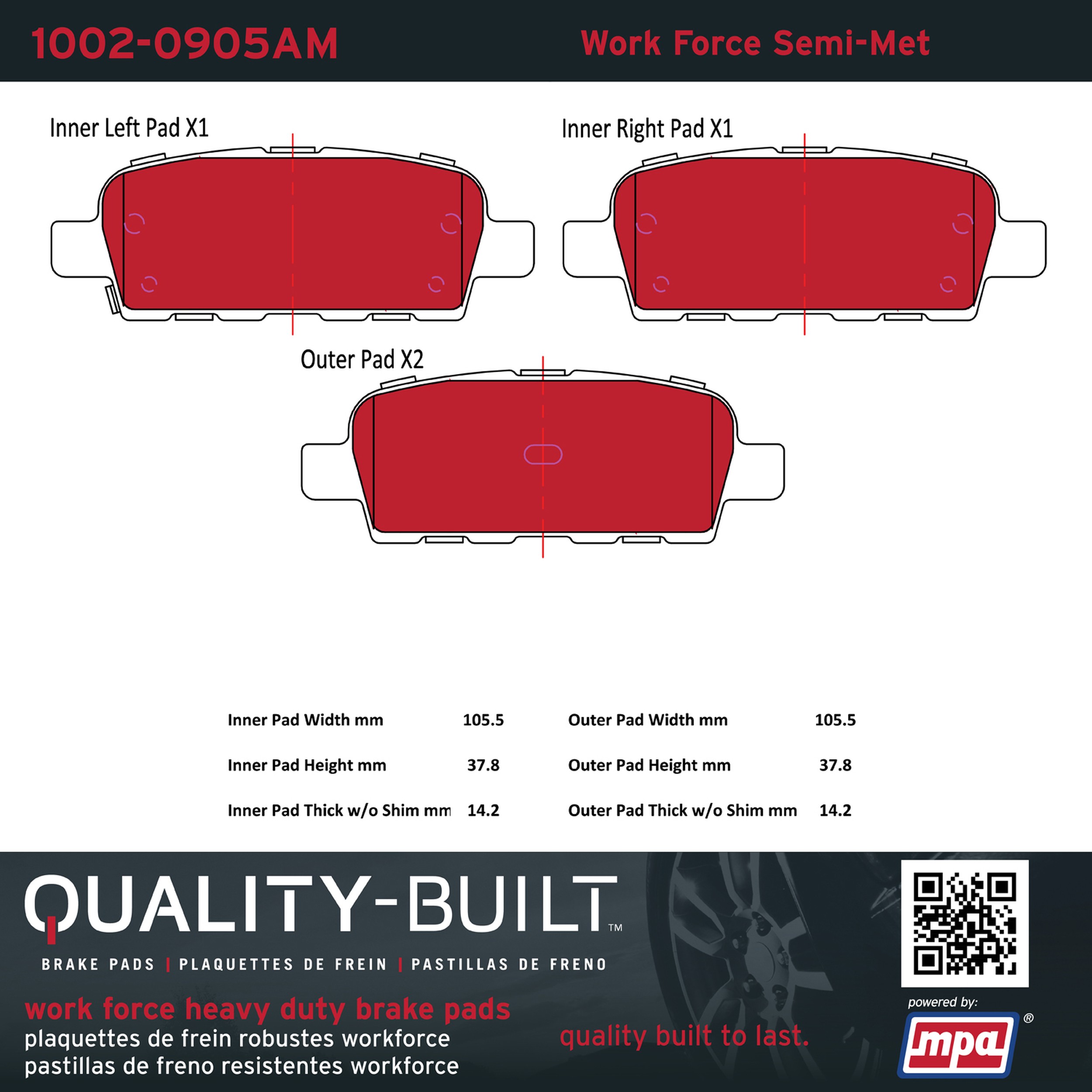 - Hardworking vehicles need hardworking brake pads, and Quality-Built Work force brake pads deliver every time. Specially formulated friction compounds are designed for high heat, heavy-duty use, where repeat stop situations, off-road driving, or towing push brake pads to the limits. Work force brake pads are an excellent choice for fleet use where extended service life and maximum durability are required.