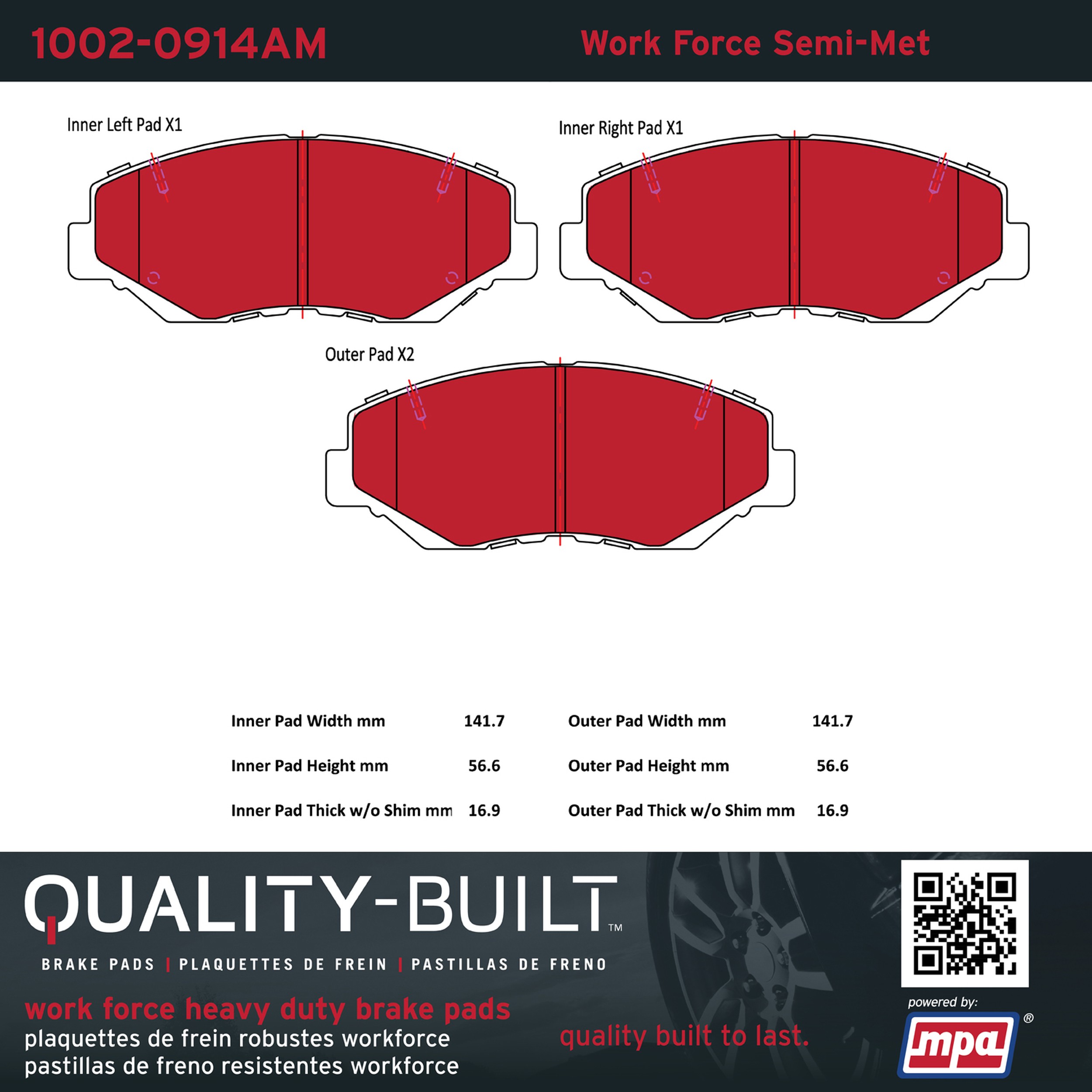 - Hardworking vehicles need hardworking brake pads, and Quality-Built Work force brake pads deliver every time. Specially formulated friction compounds are designed for high heat, heavy-duty use, where repeat stop situations, off-road driving, or towing push brake pads to the limits. Work force brake pads are an excellent choice for fleet use where extended service life and maximum durability are required.