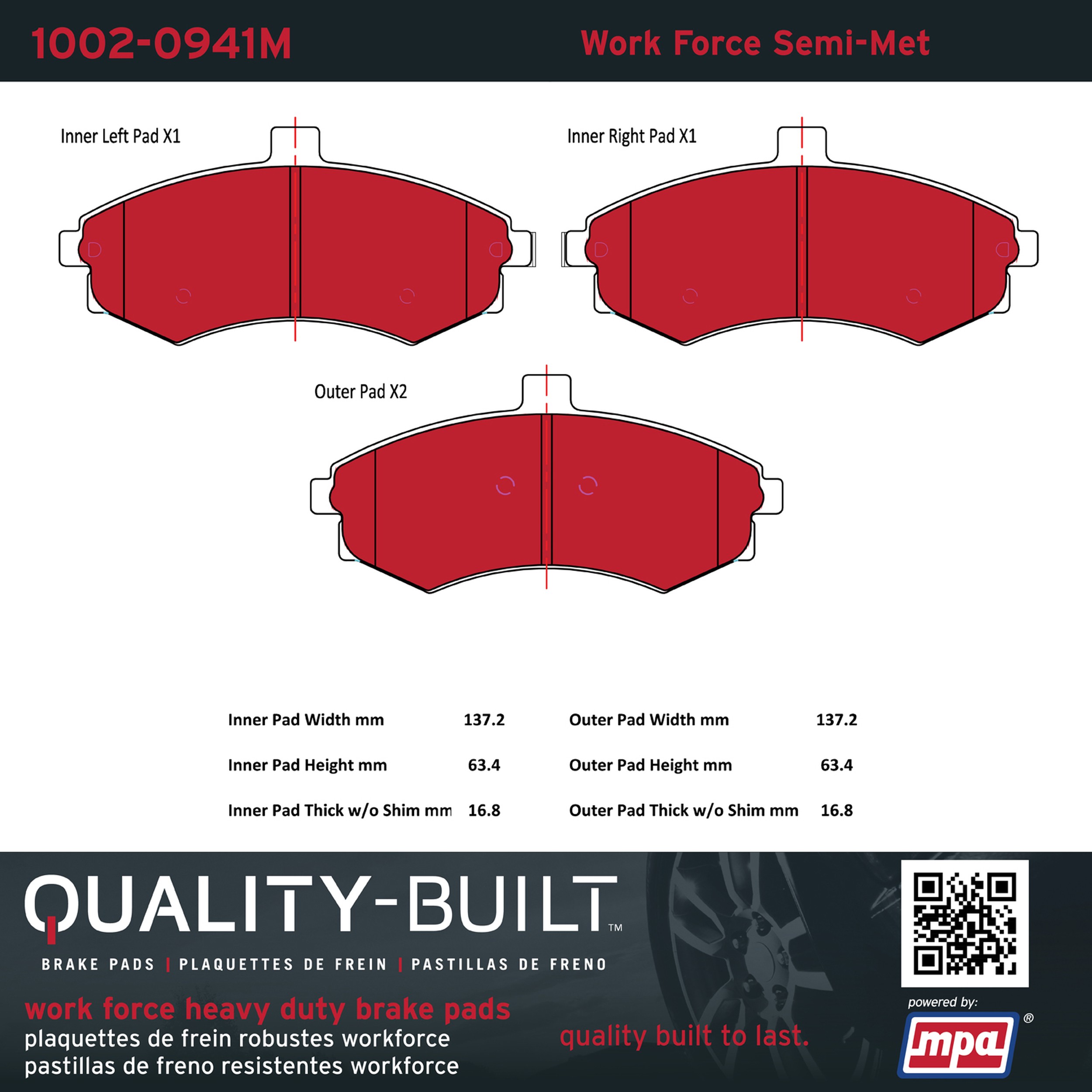 - Hardworking vehicles need hardworking brake pads, and Quality-Built Work force brake pads deliver every time. Specially formulated friction compounds are designed for high heat, heavy-duty use, where repeat stop situations, off-road driving, or towing push brake pads to the limits. Work force brake pads are an excellent choice for fleet use where extended service life and maximum durability are required.